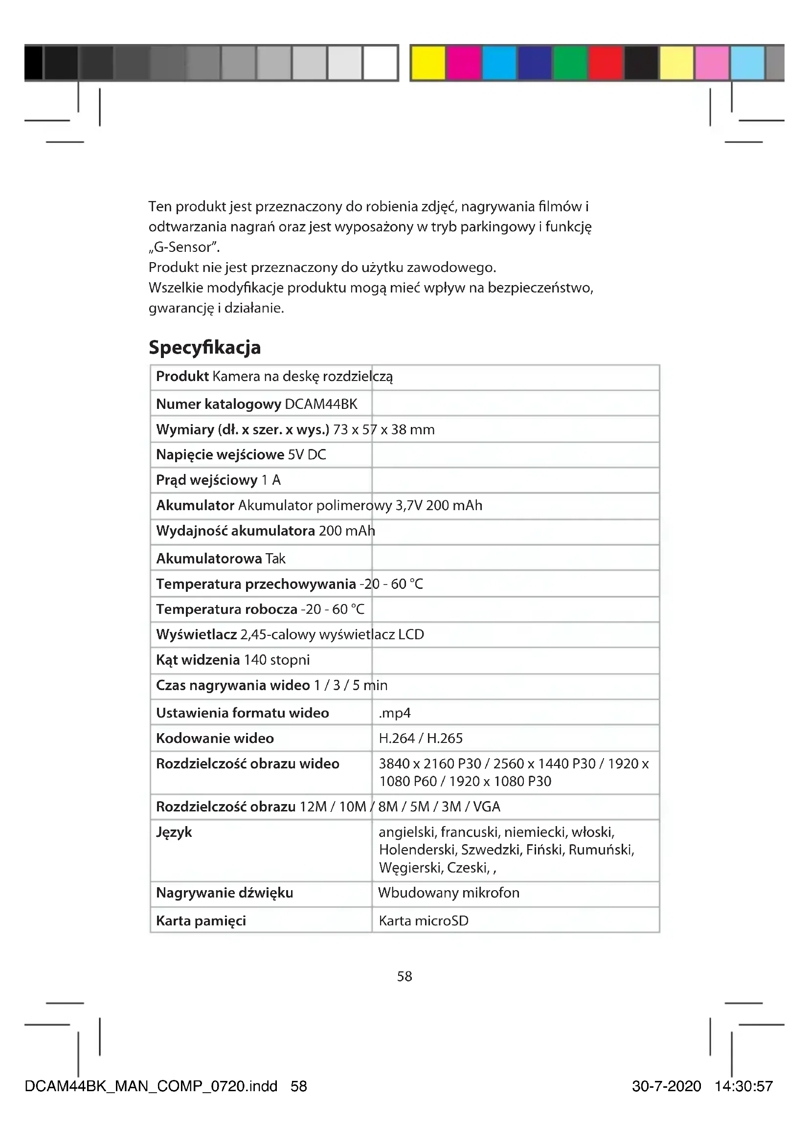 Przewodnik Szybki start Kamera na deskę rozdzielczą DCAM44BK Więcej informacji znajdziesz w rozszerzonej instrukcji obsługi online: ned.is/dcam44bk Przeznaczenie DCAM44BK to kamera samochodowa, którą można zamontować na przedniej szybie pojazdu.DCAM44BK_MAN_COMP_0720.indd 57 30-7-2020 14:30:5758 Ten produkt jest przeznaczony do robienia zdjęć, nagrywania filmów i odtwarzania nagrań oraz jest wyposażony w tryb parkingowy i funkcję „G-Sensor”. Produkt nie jest przeznaczony do użytku zawodowego. Wszelkie modyfikacje produktu mogą mieć wpływ na bezpieczeństwo, gwarancję i działanie. Specykacja Produkt Kamera na deskę rozdzielczą Numer katalogowy DCAM44BK Wymiary (dł. x szer. x wys.) 73 x 57 x 38 mm Napięcie wejściowe 5V DC Prąd wejściowy 1 A Akumulator Akumulator polimerowy 3,7V 200 mAh Wydajność akumulatora 200 mAh Akumulatorowa Tak Temperatura przechowywania -20 - 60 °C Temperatura robocza -20 - 60 °C Wyświetlacz 2,45-calowy wyświetlacz LCD Kąt widzenia 140 stopni Czas nagrywania wideo 1 / 3 / 5 min Ustawienia formatu wideo .mp4 Kodowanie wideo H.264 / H.265 Rozdzielczość obrazu wideo 3840 x 2160 P30 / 2560 x 1440 P30 / 1920 x 1080 P60 / 1920 x 1080 P30 Rozdzielczość obrazu 12M / 10M / 8M / 5M / 3M / VGA Język angielski, francuski, niemiecki, włoski, Holenderski, Szwedzki, Fiński, Rumuński, Węgierski, Czeski, , Nagrywanie dźwięku Wbudowany mikrofon Karta pamięci Karta microSD DCAM44BK_MAN_COMP_0720.indd 58 30-7-2020 14:30:5759 Pojemność karty pamięci 4 - 128 GB Interfejs USB Micro USB Samoczynne wyłączenie 1 / 3 / 5 min Wygaszacz ekranu 1 / 3 / 5 min Główne części (rysunek A)