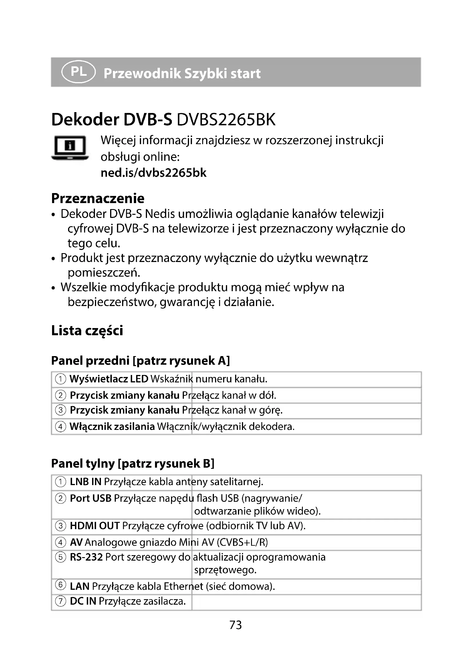Przewodnik Szybki start Dekoder DVB-S DVBS2265BK Więcej informacji znajdziesz w rozszerzonej instrukcji obsługi online: ned.is/dvbs2265bk Przeznaczenie
