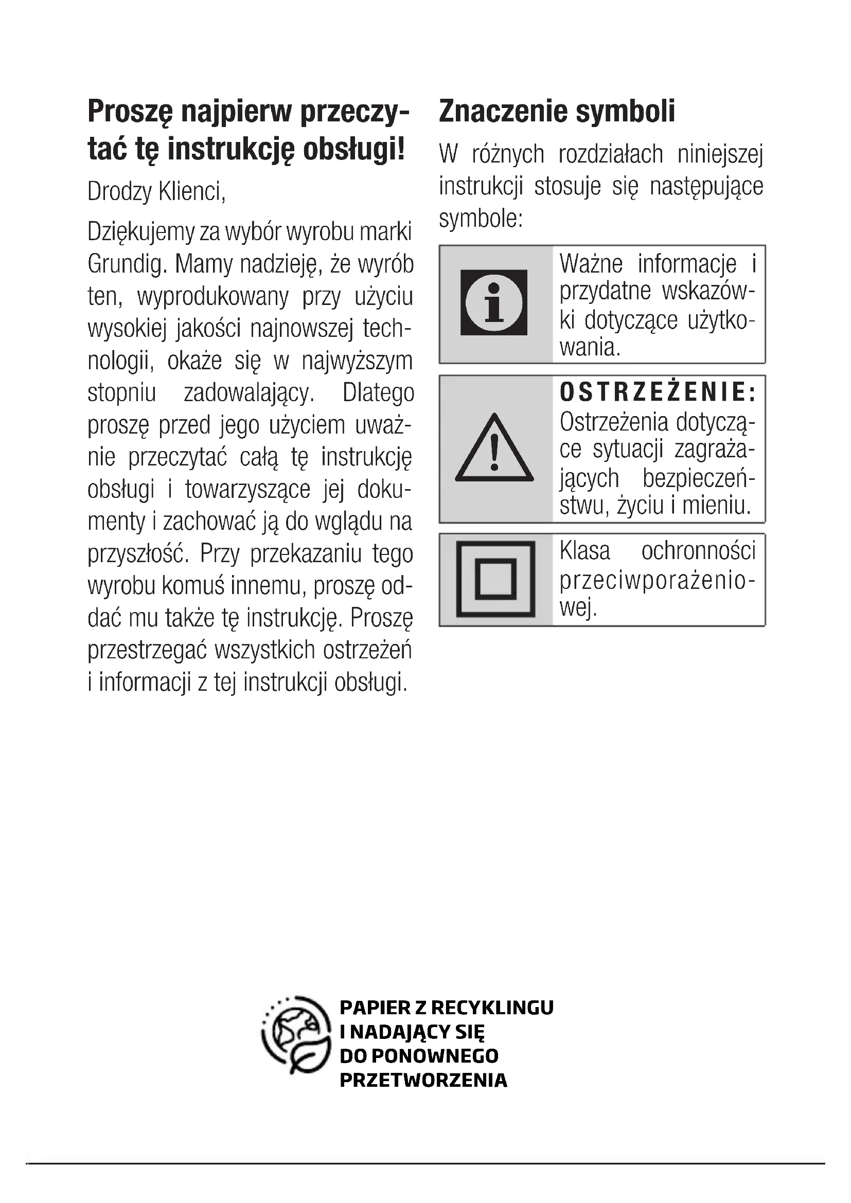 - Pazite da se uređaj nalazi izvan dosega djece. 6 Informacije Prilikom puštanja u pogon, opće uporabe i čišćenja obratite pozor-nost na upute na stranicama 4-5-6 ovog priručnika.Proszę najpierw przeczy- tać tę instrukcję obsługi! Drodzy Klienci, Dziękujemy za wybór wyrobu marki Grundig. Mamy nadzieję, że wyrób ten, wyprodukowany przy użyciu wysokiej jakości najnowszej tech- nologii, okaże się w najwyższym stopniu zadowalający. Dlatego proszę przed jego użyciem uważ- nie przeczytać całą tę instrukcję obsługi i towarzyszące jej doku- menty i zachować ją do wglądu na przyszłość. Przy przekazaniu tego wyrobu komuś innemu, proszę od- dać mu także tę instrukcję. Proszę przestrzegać wszystkich ostrzeżeń i informacji z tej instrukcji obsługi. Znaczenie symboli W różnych rozdziałach niniejszej instrukcji stosuje się następujące symbole: