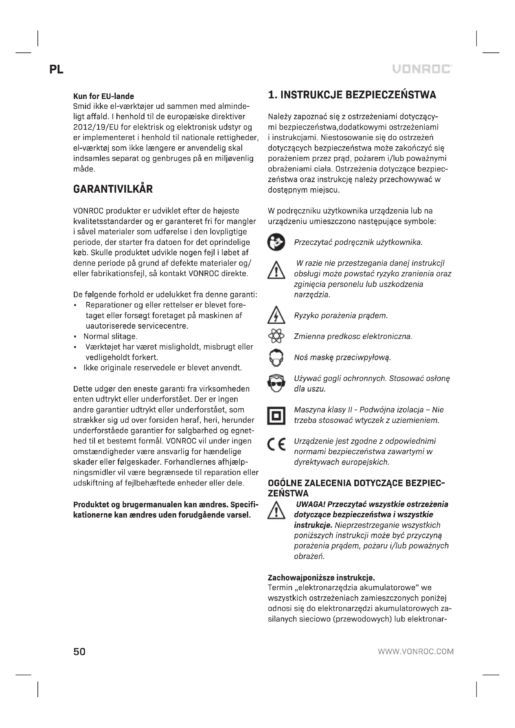 - Użyto części zamiennych innych niż oryginalne. Niniejsza gwarancja to wyłączna gwarancja pro- ducenta i nie obowiązują żadne inne wyrażone ani dorozumiane gwarancje. Nie obowiązują żadne inne wyrażone ani dorozumiane gwarancje o zakresie przekraczającym niniejszą gwarancję, co obejmuje dorozumiane gwarancje przydatności do sprzedaży i przydatności do określonego celu. W żadnym przy- padku firma VONROC nie ponosi odpowiedzialności za straty przypadkowe lub wynikowe. Zadośćuczy- nienie sprzedawcy jest ograniczone do naprawy lub wymiany niezgodnych urządzeń lub części. Produkt i instrukcja obsługi podlegają zmianom. Dane techniczne podlegają zmianom bez uprzed- zenia.