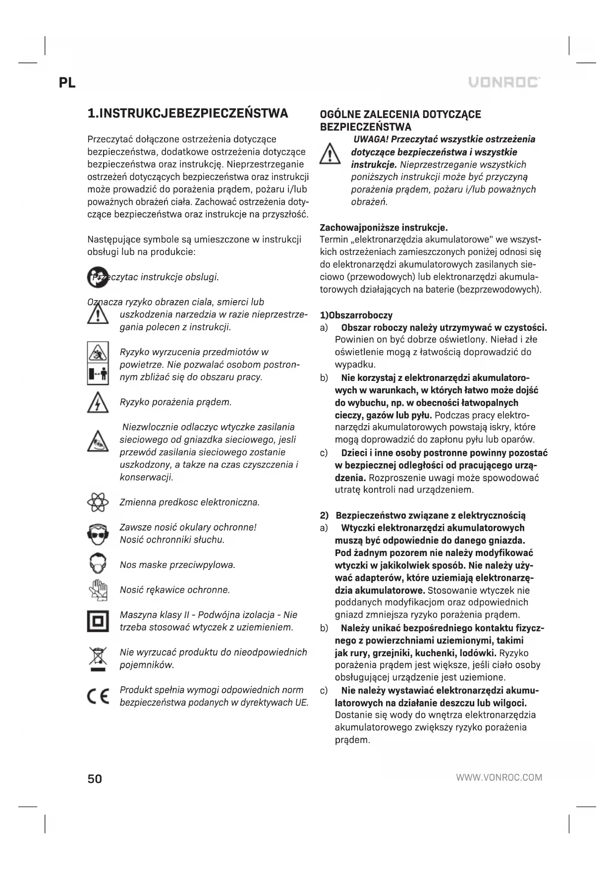 Zawsze odłączać narzędzie od zasilania sieciowego przed rozpoczęciem przeprowa- dzania jakichkolwiek prac konserwacyjnych. Czyścić obudowę maszyny regularnie miękką ście- reczką, najlepiej po każdym użyciu. Dopilnować, aby otwory wentylacyjne były wolne od pyłu, kurzu i zabrudzeń. Usuwać oporne zabrudzenia miękką ściereczką zwilżoną mydlinami. Nie używać żad- nych rozpuszczalnikow, takich jak benzyna, alkohol, amoniak itp. Takie substancje chemiczne spowodu- ją uszkodzenie części z tworzyw sztucznych. SRODOWISKO Uszkodzone i/lub niepotrzebne urzadzenia elektryczne lub elektroniczne podlegaja zbiorce w odpowiednich punktach recyklingu. Tylko kraje WE Nie wyrzucac elektronarzedzi wraz z odpadami z gospodarstw domowych. Zgodnie z dyrektywa 2012/19/WE dotyczaca zuzytych urzadzen elek- trycznych i elektronicznych oraz jej wdrozeniem do prawodawstwa krajowego, elektronarzedzia, ktore juz nie nadaja sie do uzytku, podlegaja oddziel- nej zbiorce oraz utylizacji w sposob przyjazny dla srodowiska. GWARANCJA Produkty VONROC są wytwarzane zgodnie z najwyż- szymi standardami jakości i producent udziela gwarancji na wady materiałowe i wady wykonania na okres wymagany prawem, licząc od dnia zaku- pu. Jeśli wystąpi usterka produktu w tym okresie spowodowana wadą materiałową i/lub wadą wykonania, proszę bezpośrednio skontaktować się ze sprzedawcą VONROC. Następujące okoliczności powodują unieważnienie gwarancji: