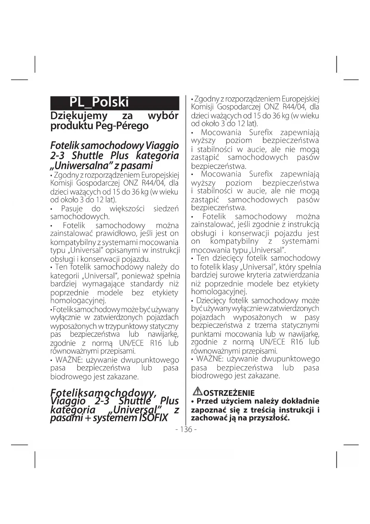 - Numer seryjny: każdy fotelik jest identyfikowany własnym numerem podczas nadania numeru homologacji typu. PEG-PÉREGO S.p.A. Peg-Perego SpA to firma z wdrożonym systemem zarządzania jakością certyfikowanym przez TÜV Italia Srl, zgodnie z normą ISO 9001. Producent Peg-Pérego zastrzega sobie prawo do wprowadzania zmian w modelach prezentowanych w niniejszej publikacji dla celów technicznych i reklamowych. Serwis gwarancyjny i pogwarancyjny Peg-Pérego Jeżeli jakakolwiek z części zgubi się lub ulegnie zniszczeniu, nie używaj zamienników. W celu zdobycia informacji, wymiany lub naprawy produktu bądź zakupienia oryginalnych części możesz skontaktować się z producentem lub dystrybutorem w swoim kraju. tel. 0039/039/60.88.213 e-mail assistenza@pegperego.it www.pegperego.com Wszelkie prawa autorskie dotyczące treści niniejszej instrukcji są własnością firmy Peg-Pérego S.p.A. i są chronione obowiązującym prawem.- 144 - Дякуємо за вибір продукції Peg-Pérego. Дитяче автокрісло Viaggio 2-3 Shuttle Plus, категорія „Напівуніверсальне”, із використанням ременів