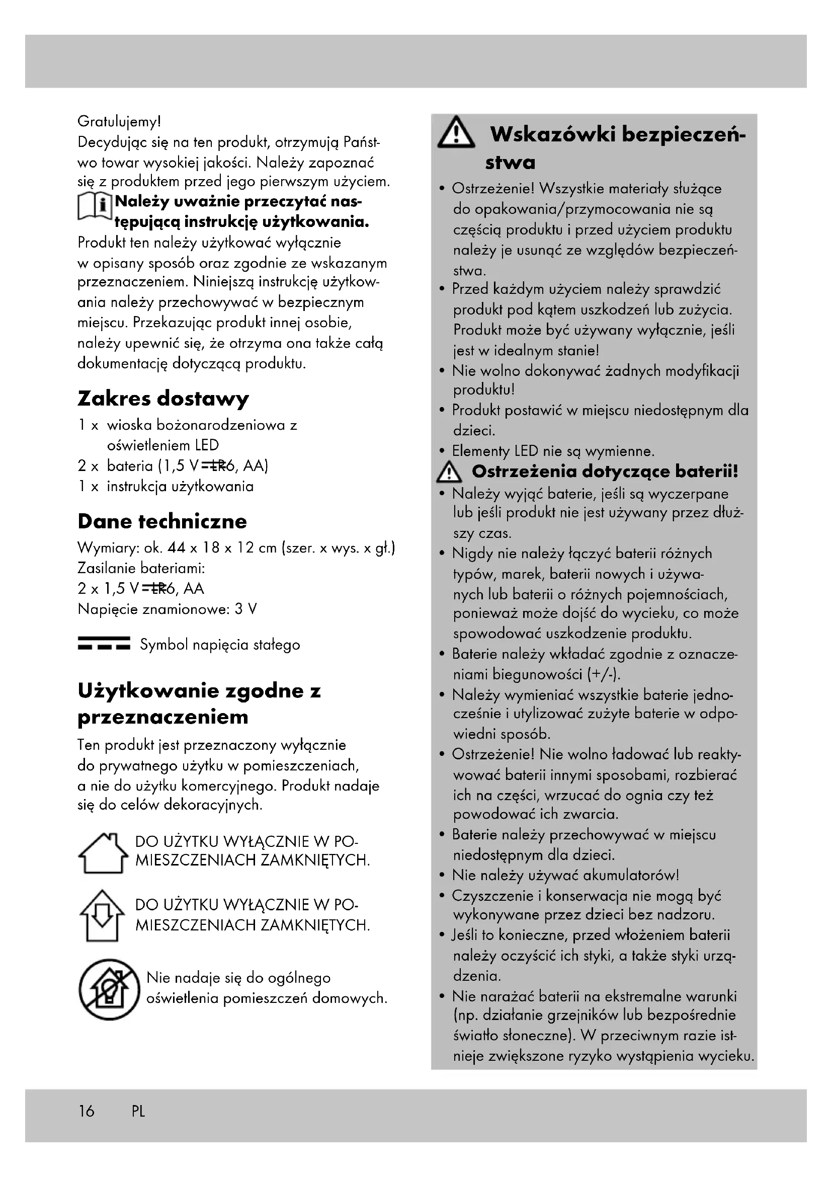 NL/BE15 Het artikel en de verpakkingsmaterialen zijn recyclebaar; voer ze gescheiden af voor een be- tere afvalbehandeling. Het Triman-logo is alleen van toepassing voor Frankrijk. Informatie over de mogelijkheden om het afgedankte artikel af te voeren, wordt verstrekt door de gemeentelijke overheid. Opmerkingen over garantie en serviceafhandeling Het product is geproduceerd met grote zorg en onder voortdurende controle. U ontvangt een garantie van drie jaar op dit product, vanaf de datum van aankoop. Bewaar alstublieft uw aankoopbewijs. De garantie geldt alleen voor materiaal- en fa- bricagefouten en vervalt bij foutief of oneigenlijk gebruik. Uw wettelijke rechten, met name het garantierecht, worden niet beïnvloed door deze garantie. In geval van reclamaties dient u zich aan de beneden genoemde service-hotline te wenden of zich per e-mail met ons in verbinding te zetten. Onze servicemedewerkers zullen de verdere handelswijze zo snel mogelijk met u afspreken. Wij zullen u in ieder geval persoonlijk te woord staan. De garantieperiode wordt na eventuele repa- raties en op basis van de garantie, wettelijke garantie of coulance niet verlengd. Dit geldt ook voor vervangen en gerepareerde delen. Na afloop van de garantieperiode dienen eventuele reparaties te worden betaald. IAN: 323296_1901 Service België Tel.: 070 270 171 (0,15 EUR/Min.) E-Mail: deltasport@lidl.be Service Nederland Tel.: 0900 0400223 (0,10 EUR/Min.) E-Mail: deltasport@lidl.nl NL/BE16 Gratulujemy! Decydując się na ten produkt, otrzymują Państ- wo towar wysokiej jakości. Należy zapoznać się z produktem przed jego pierwszym użyciem. Należy uważnie przeczytać nas- tępującą instrukcję użytkowania. Produkt ten należy użytkować wyłącznie w opisany sposób oraz zgodnie ze wskazanym przeznaczeniem. Niniejszą instrukcję użytkow- ania należy przechowywać w bezpiecznym miejscu. Przekazując produkt innej osobie, należy upewnić się, że otrzyma ona także całą dokumentację dotyczącą produktu. Zakres dostawy 1 x wioska bożonarodzeniowa z oświetleniem LED 2 x bateria (1,5 V LR6, AA) 1 x instrukcja użytkowania Dane techniczne Wymiary: ok. 44 x 18 x 12 cm (szer. x wys. x gł.) Zasilanie bateriami: 2 x 1,5 V LR6, AA Napięcie znamionowe: 3 V Symbol napięcia stałego Użytkowanie zgodne z przeznaczeniem Ten produkt jest przeznaczony wyłącznie do prywatnego użytku w pomieszczeniach, a nie do użytku komercyjnego. Produkt nadaje się do celów dekoracyjnych. DO UŻYTKU WYŁĄCZNIE W PO- MIESZCZENIACH ZAMKNIĘTYCH. DO UŻYTKU WYŁĄCZNIE W PO- MIESZCZENIACH ZAMKNIĘTYCH. Nie nadaje się do ogólnego oświetlenia pomieszczeń domowych. Wskazówki bezpieczeń- stwa