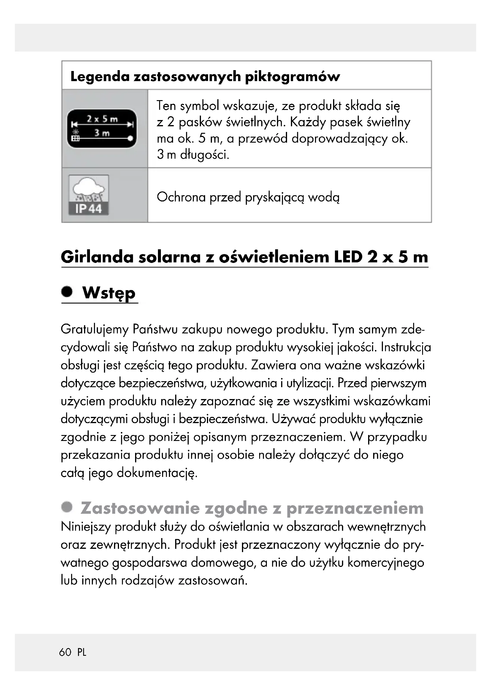 Solarny łańcuch świetlny LED Zawartość 1 girlanda solarna z oświetleniem LED 2 x 5 m 1 stojak wbijany do ziemi 1 drążek 1 wskazówki dotyczące montażu, obsługi i bezpieczeństwa Dane techniczne Napięcie robocze: 3,7 V (prąd stały) Akumulator: 1 x 3,7 V (prąd stały) niewymienny / akumulator litowo-jonowy z 1300 mAh LED: HG05422A: 100 LED x 0,06 W (ciepły biały) HG05422B: 100 LED x 0,06 W (zimny biały) HG05422C: 100 LED x 0,06 W (wiele kolorów (czerwony, zielony, żółty i niebieski)) Stopień ochrony: IP44 (ochrona przed rozbryzgami wody) Panel słoneczny: ok. 11,5 x 11,5 cm62 PL Czas świecenia (przy naładowanym akumulatorze): ok. 8 godzin Wskazówki bezpieczeństwa PRZED UŻYCIEM NALEŻY ZAPOZNAĆ SIĘ Z INSTRUKCJĄ OBSŁUGI! INSTRUKCJĘ OBSŁUGI NALEŻY ZACHOWAĆ! W PRZYPADKU PRZEKAZANIA PRODUKTU W RĘCE OSOBY TRZECIEJ, PROSIMY O PRZEKAZANIE TAKŻE WSZYSTKICH NALEŻĄCYCH DO PRODUKTU INSTRUKCJI I INNYCH DOKU- MENTÓW. Niniejszy produkt może być używany przez dzieci od lat 8 oraz przez osoby z obniżonymi zdolnościami fizycznymi, sensorycznymi lub mentalnymi lub brakiem doświadczenia i /lub wiedzy, jeśli pozostają pod nadzorem lub zostały pouczone w kwestii bezpiecznego użycia produktu i rozumieją wynika- jące z niego zagrożenia. Dzieci nie mogą bawić się produk- tem. Czyszczenie i konserwacja nie mogą być wykonywane przez dzieci bez nadzoru. Nie używać produktu w razie wykrycia jakichkolwiek uszkodzeń. Wyłączyć produkt, jeśli jest przechowywany w ciemnym oto- czeniu, aby uniknąć rozładowania akumulatorów. Wymiana diod LED jest niemożliwa. Jeśli diody LED przestaną działać z powodu zużycia, należy wymienić cały produkt. Ten produkt nie zawiera elementów, które mogą być konser- wowane przez użytkownika. Produkt nigdy nie podłączać do gniazdka 230 V∼ (prąd zmienny).63 PL Niniejszy produkt nie jest zabawką, nie powinien znaleźć się w rękach dzieci. Dzieci nie są w stanie rozpoznać ryzyka, jakie powstaje poprzez obchodzenie się z produktem. OSTRZEŻENIE! Nie należy używać tego łańcucha świetlnego bez wszystkich odpowiednio nałożonych uszczelek. Wskazówki dotyczące bezpieczeństwa charakterystyczne dla produktu Należy uważać, aby panel słoneczny