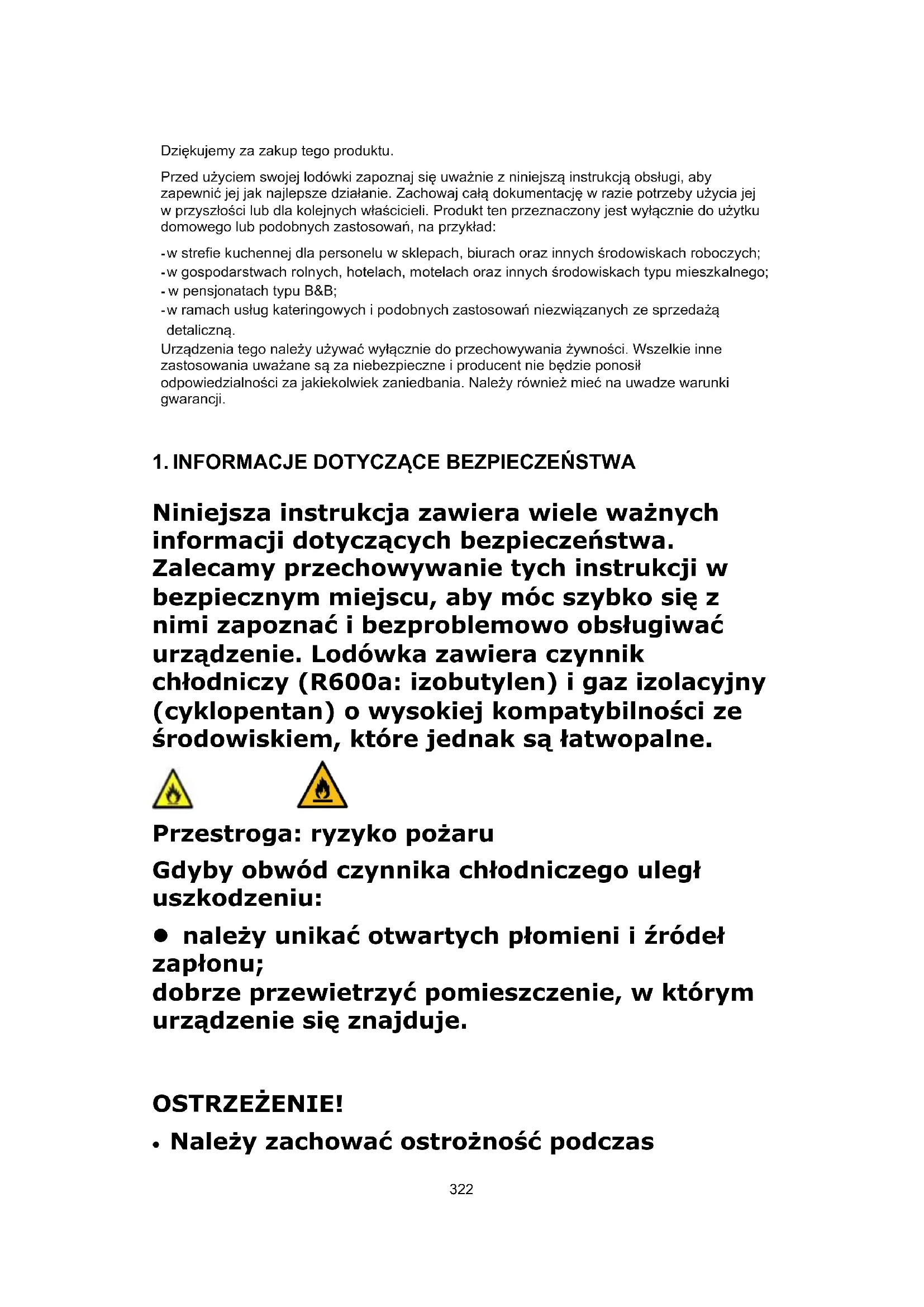 Dziękujemy za zakup tego produktu. Przed użyciem swojej lodówki zapoznaj się uważnie z niniejszą instrukcją obsługi, aby zapewnić jej jak najlepsze działanie. Zachowaj całą dokumentację w razie potrzeby użycia jej w przyszłości lub dla kolejnych właścicieli. Produkt ten przeznaczony jest wyłącznie do użytku domowego lub podobnych zastosowań, na przykład: - w strefie kuchennej dla personelu w sklepach, biurach oraz innych środowiskach roboczych; - w gospodarstwach rolnych, hotelach, motelach oraz innych środowiskach typu mieszkalnego; - w pensjonatach typu B&B; - w ramach usług kateringowych i podobnych zastosowań niezwiązanych ze sprzedażą detaliczną. Urządzenia tego należy używać wyłącznie do przechowywania żywności. Wszelkie inne zastosowania uważane są za niebezpieczne i producent nie będzie ponosił odpowiedzialności za jakiekolwiek zaniedbania. Należy również mieć na uwadze warunki gwarancji.