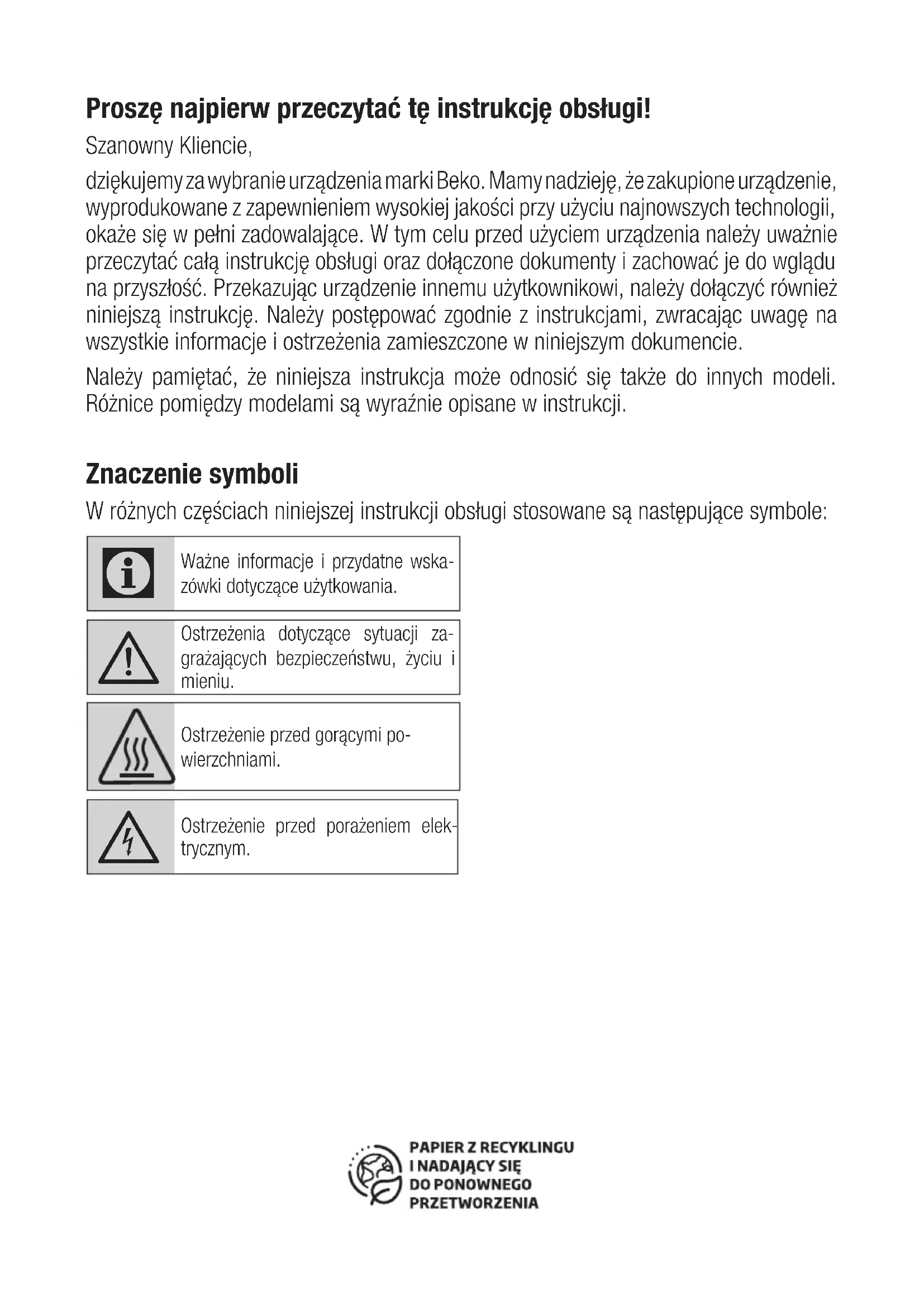 - La caduta dell'apparecchio ne causerà il mal- funzionamento o potrebbe essere causa di danni permanenti.www.grundig.itProszę najpierw przeczytać tę instrukcję obsługi! Szanowny Kliencie, dziękujemy za wybranie urządzenia marki Beko. Mamy nadzieję, że zakupione urządzenie, wyprodukowane z zapewnieniem wysokiej jakości przy użyciu najnowszych technologii, okaże się w pełni zadowalające. W tym celu przed użyciem urządzenia należy uważnie przeczytać całą instrukcję obsługi oraz dołączone dokumenty i zachować je do wglądu na przyszłość. Przekazując urządzenie innemu użytkownikowi, należy dołączyć również niniejszą instrukcję. Należy postępować zgodnie z instrukcjami, zwracając uwagę na wszystkie informacje i ostrzeżenia zamieszczone w niniejszym dokumencie. Należy pamiętać, że niniejsza instrukcja może odnosić się także do innych modeli. Różnice pomiędzy modelami są wyraźnie opisane w instrukcji. Znaczenie symboli W różnych częściach niniejszej instrukcji obsługi stosowane są następujące symbole: