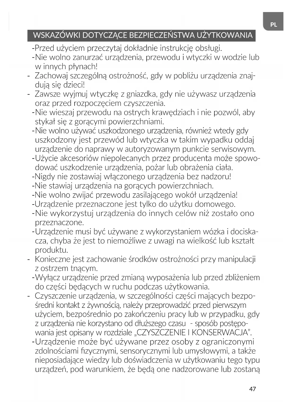 Użycie akcesoriów niepolecanych przez producenta może spowo- dować uszkodzenie urządzenia, pożar lub obrażenia ciała. - Nigdy nie zostawiaj włączonego urządzenia bez nadzoru! - Nie stawiaj urządzenia na gorących powierzchniach. - Nie wolno zwijać przewodu zasilającego wokół urządzenia! - Urządzenie przeznaczone jest tylko do użytku domowego.