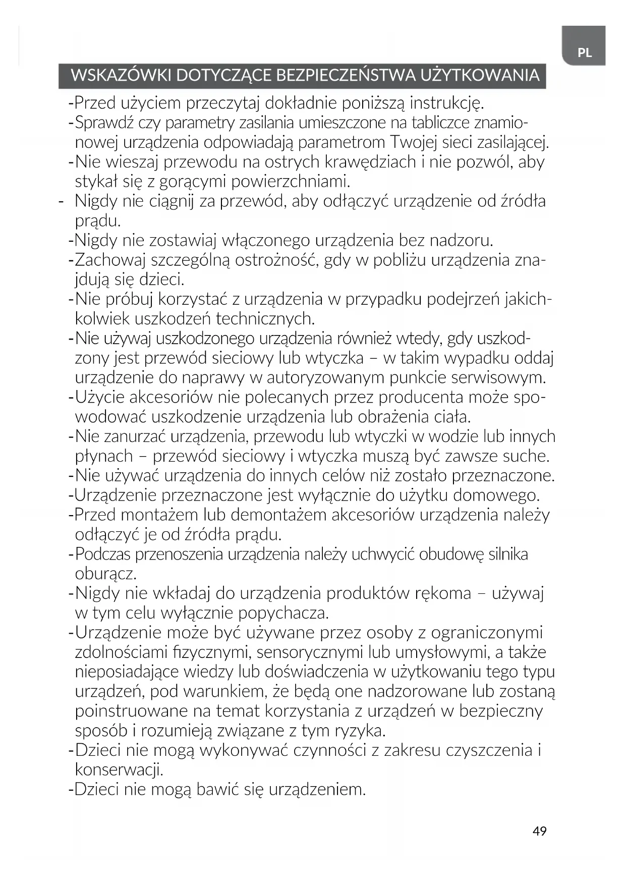 Nie używać urządzenia do innych celów niż zostało przeznaczone. - Urządzenie przeznaczone jest wyłącznie do użytku domowego. - Przed montażem lub demontażem akcesoriów urządzenia należy odłączyć je od źródła prądu.