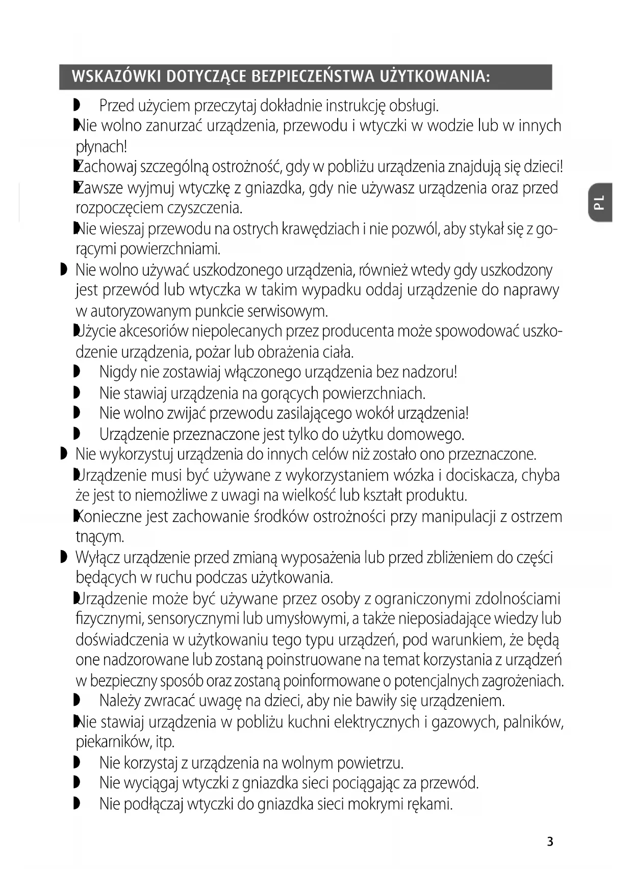 3. Nie wolno zanurzać urządzenia w wodzie lub innych płynach, jak też myć w zmywarkach