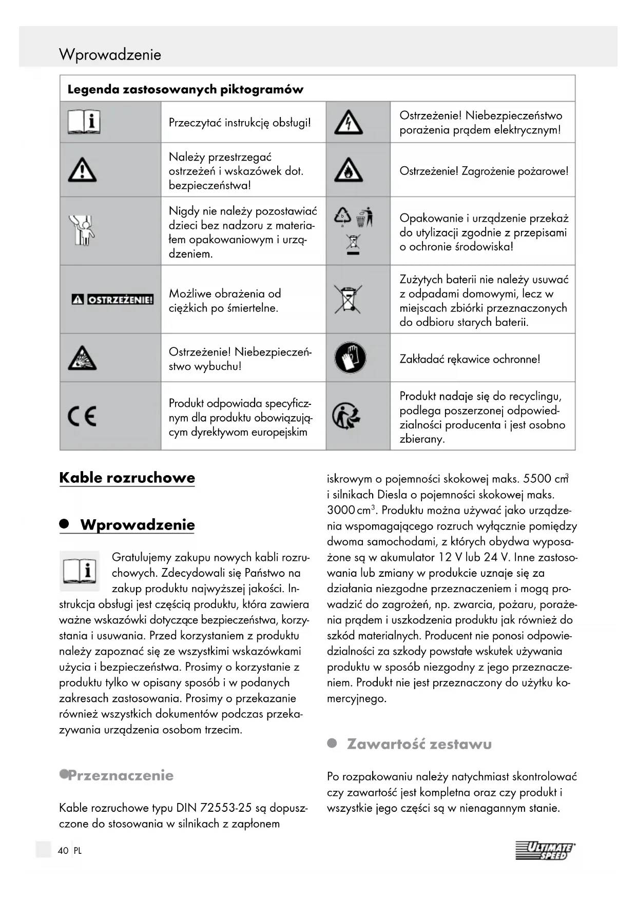 Wprowadzenie Gratulujemy zakupu nowych kabli rozru- chowych. Zdecydowali się Państwo na zakup produktu najwyższej jakości. In- strukcja obsługi jest częścią produktu, która zawiera ważne wskazówki dotyczą ce bezpieczeństwa, korzy-