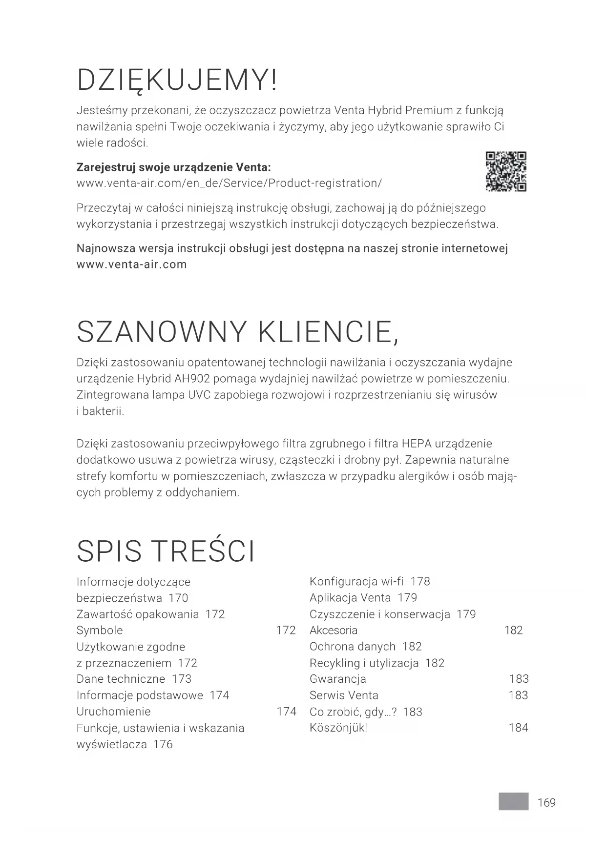 Informacje dotyczące bezpieczeństwa 170 Zawartość opakowania 172 Symbole 172 Użytkowanie zgodne zprzeznaczeniem 172 Dane techniczne 173 Informacje podstawowe 174 Uruchomienie 174 Funkcje, ustawienia iwskazania wyświetlacza 176 Konfiguracja wi-fi 178 Aplikacja Venta 179 Czyszczenie ikonserwacja 179 Akcesoria 182 Ochrona danych 182 Recykling iutylizacja 182 Gwarancja 183 Serwis Venta 183 Co zrobić, gdy…? 183 Köszönjük! 184170 PL