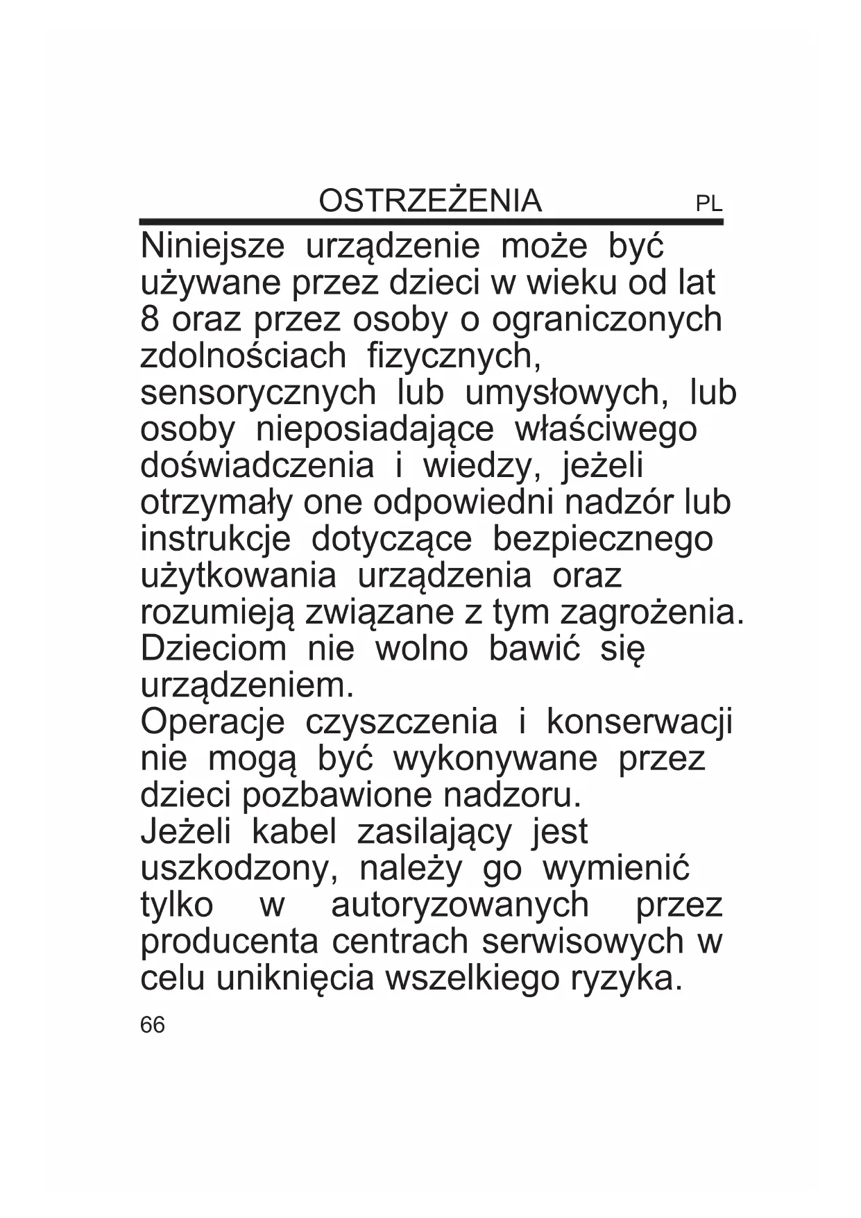 Niniejsze urządzenie może być używane przez dzieci w wieku od lat 8 oraz przez osoby o ograniczonych zdolnościach zycznych, sensorycznych lub umysłowych, lub osoby nieposiadające właściwego doświadczenia i wiedzy, jeżeli otrzymały one odpowiedni nadzór lub instrukcje dotyczące bezpiecznego użytkowania urządzenia oraz rozumieją związane z tym zagrożenia. Dzieciom nie wolno bawić się urządzeniem. Operacje czyszczenia i konserwacji nie mogą być wykonywane przez dzieci pozbawione nadzoru. Jeżeli kabel zasilający jest uszkodzony, należy go wymienić tylko w autoryzowanych przez producenta centrach serwisowych w celu uniknięcia wszelkiego ryzyka.67 UWAGA: uważnie przeczytać niniejszą instrukcję, ponieważ zawiera one ważne informacje dotyczące bezpiecznego montażu, obsługi i konserwacji urządzenia. Ważne instrukcje, które należy zachować do wykorzystania w przyszłości. Dzieci NIE mogą bawić się urządzeniem. Urządzenie to może być używane wyłącznie do celów, do których zostało wyraźnie przeznaczone; każde użycie niezgodne ze wskazówkami zawartymi w niniejszej instrukcji należy uznać za niewłaściwe i niebezpieczne. Producent nie ponosi odpowiedzialności za ewentualne szkody wynikające z niewłaściwego i/lub nieracjonalnego użytkowania. Niniejsze urządzenie NIE nadaje się do stosowania w przestrzeniach zagrożonych wybuchem (w obecności substancji palnych w postaci gazu, pary, mgły lub pyłu, w warunkach atmosferycznych, w których po zapłonie spalanie obejmuje całe powietrze). Elementów opakowania (plastikowe woreczki, styropian itp.) nie należy pozostawiać w zasięgu dzieci lub osób niepełnosprawnych, ponieważ są one potencjalnym źródłem zagrożenia. Instalację i montaż urządzenia należy przeprowadzić zgodnie z zaleceniami producenta. Nieprawidłowa procedura może spowodować obrażenia ludzi, zwierząt lub szkody rzeczowe, za które producent nie może ponosić odpowiedzialności. Umieścić urządzenie i używać go na poziomej i stabilnej powierzchni. Przed użyciem urządzenia sprawdzić wzrokowo jego stan oraz stan jego przewodu zasilającego. W przypadku wątpliwości zapytać wykwalikowanego technika. Przed zdjęciem osłon ochronnych upewnić się, że wentylator jest odłączony od sieci zasilania. Nie podłączać urządzenia do zasilania i nie używać go, jeżeli nie jest kompletnie zmontowane (patrz instrukcje montażu).68 Przed podłączeniem urządzenia do źródła zasilania upewnić się, że jego dane znamionowe (napięcie i częstotliwość) odpowiadają danym sieci elektroenergetycznej, a gniazdko jest odpowiednie do wtyczki, w jaką wyposażone jest urządzenie. Sprawdzić, czy używana do zasilania instalacja elektryczna jest wyposażona w odpowiednie zabezpieczenia zgodnie z obowiązującymi przepisami. NIE podłączać urządzenia do listew zasilających. W miarę możliwości unikać używania adapterów lub przedłużaczy; jeżeli korzystanie z nich jest konieczne, używać wyłącznie materiału spełniającego wymagania obowiązujących przepisów bezpieczeństwa oraz zgodnie z parametrami elektrycznymi używanych adapterów. Urządzenie nie może być uruchamiane za pomocą zewnętrznych przekaźników czasowych lub innych zdalnych urządzeń sterujących, które nie zostały wyraźnie przewidziane w niniejszej instrukcji. NIE używać ani nie przechowywać urządzenia w pobliżu lokalnych źródeł ciepła (kaloryfery, piecyki itp.). NIE wkładać urządzenia do wody lub innych płynów; w razie przypadkowego upadku do wody NIE próbować go wyciągać, ale natychmiast wyjąć z gniazdka kabel zasilania. Przed pierwszym użyciem upewnić się, że usunięto wszelkie etykiety lub folie ochronne, które mogłyby przeszkadzać w prawidłowej pracy urządzenia. Podłączać i rozłączać kabel zasilania suchymi rękoma, trzymając go mocno. Przed włożeniem wtyczki do gniazdka elektrycznego upewnić się, że przycisk startu urządzenia znajduje się w pozycji „OFF” (wyłączony). Zawsze należy rozwijać cały przewód zasilający, aby nie dopuścić do jego przegrzania; nie należy naciągać przewodu (nie ciągnąć, nie szarpać ani nie używać go do przesuwania urządzenia, do którego jest podłączony). Nie układać kabla zasilania na ściernych lub ostrych powierzchniach lub w miejscach, w których może łatwo ulec uszkodzeniu. NIE zakrywać częściowo ani całkowicie wlotów powietrza i nie wkładać do nich przedmiotów. Podczas pracy nie dotykać urządzenia mokrymi lub wilgotnymi częściami ciała, zawsze zaleca się umieszczenie między ciałem a podłożem warstwy izolacyjnej (na przykład używając obuwia z gumową podeszwą). Podczas użytkowania urządzenie musi znajdować się w bezpiecznej odległości od wszelkich przedmiotów lub substancji łatwopalnych lub potencjalnie wybuchowych. W przypadku nieprawidłowego działania lub nieprawidłowości podczas pracy należy natychmiast wyłączyć urządzenie, odłączyć od zasilania, sprawdzić przyczyny napotkanych nieprawidłowości, ewentualnie korzystając z pomocy wykwalikowanego personelu technicznego. W69 żadnym wypadku nie należy wykonywać czynności nieprzewidzianych w niniejszej instrukcji obsługi (np. demontować i/lub modykować urządzenia). Zawsze pamiętać o odłączeniu kabla zasilania urządzenia w przypadku długich okresów nieużytkowania, przed jego odłożeniem i przed przystąpieniem do jakichkolwiek czynności związanych z czyszczeniem lub konserwacją. Przechowywać i używać urządzenia wyłącznie w pomieszczeniach lub w każdym razie zabezpieczonych przed działaniem czynników atmosferycznych, takich jak deszcz, bezpośrednie promieniowanie słoneczne lub kurz. Urządzenie nie zostało zaprojektowane do użytku ani przechowywania na zewnątrz. Czyszczenie i konserwacja urządzenia NIE mogą być wykonywane przez dzieci pozbawione nadzoru osoby dorosłej. Przed odłąc