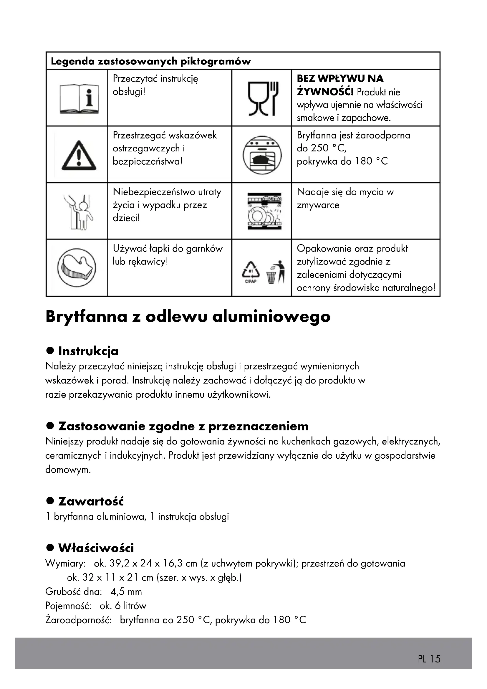 ŻYWNOŚĆ! Produkt nie wpływa ujemnie na właściwości smakowe i zapachowe. Przestrzegać wskazówek ostrzegawczych i bezpieczeństwa! Brytfanna jest żaroodporna do 250 °C, pokrywka do 180 °C Niebezpieczeństwo utraty życia i wypadku przez dzieci! Nadaje się do mycia w zmywarce Używać łapki do garnków lub rękawicy! Opakowanie oraz produkt zutylizować zgodnie z zaleceniami dotyczącymi ochrony środowiska naturalnego! Brytfanna z odlewu aluminiowego l Instrukcja Należy przeczytać niniejszą instrukcję obsługi i przestrzegać wymienionych wskazówek i porad. Instrukcję należy zachować i dołączyć ją do produktu w razie przekazywania produktu innemu użytkownikowi. l Zastosowanie zgodne z przeznaczeniem Niniejszy produkt nadaje się do gotowania żywności na kuchenkach gazowych, elektrycznych, ceramicznych i indukcyjnych. Produkt jest przewidziany wyłącznie do użytku w gospodarstwie domowym. l Zawartość 1 brytfanna aluminiowa, 1 instrukcja obsługi l Właściwości Wymiary: ok. 39,2 x 24 x 16,3 cm (z uchwytem pokrywki); przestrzeń do gotowania ok. 32 x 11 x 21 cm (szer. x wys. x głęb.) Grubość dna: 4,5 mm Pojemność: ok. 6 litrów Żaroodporność: brytfanna do 250 °C, pokrywka do 180 °C16 PL Nadaje się do następujących urządzeń: Kuchenka gazowa Kuchenka indukcyjna Kuchenka elektryczna Halogenowa płyta kuchenna Szklano-ceramiczna płyta kuchenna