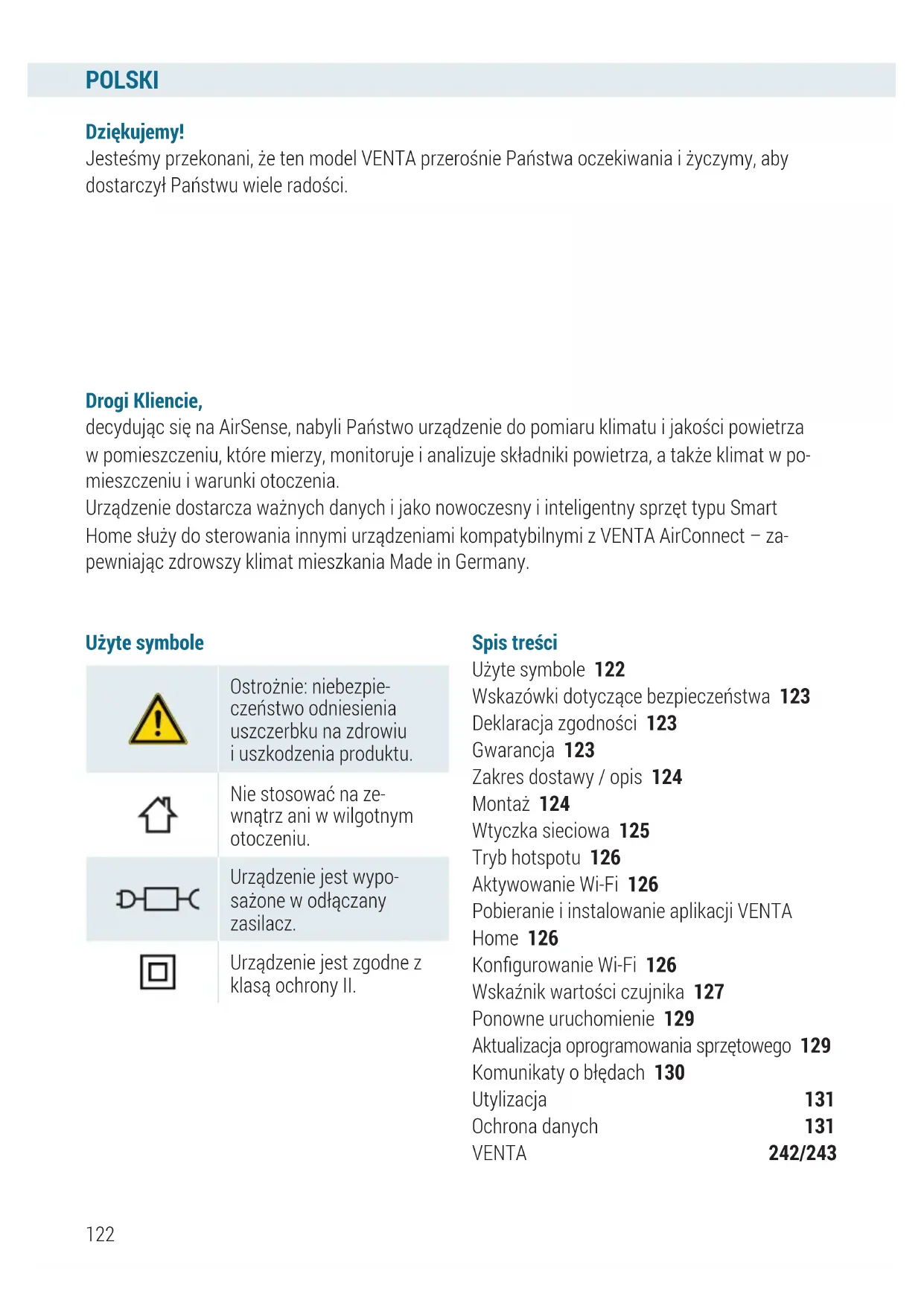 Użyte symbole Dziękujemy! Jesteśmy przekonani, że ten model VENTA przerośnie Państwa oczekiwania iżyczymy, aby dostarczył Państwu wiele radości. Drogi Kliencie, decydując się na AirSense, nabyli Państwo urządzenie do pomiaru klimatu ijakości powietrza wpomieszczeniu, które mierzy, monitoruje ianalizuje składniki powietrza, a także klimat wpo- mieszczeniu iwarunki otoczenia. Urządzenie dostarcza ważnych danych ijako nowoczesny i inteligentny sprzęt typu Smart Home służy do sterowania innymi urządzeniami kompatybilnymi z VENTA AirConnect – za- pewniając zdrowszy klimat mieszkania Made in Germany. Ostrożnie: niebezpie- czeństwo odniesienia uszczerbku na zdrowiu iuszkodzenia produktu. Nie stosować na ze- wnątrz ani wwilgotnym otoczeniu. Urządzenie jest wypo- sażone wodłączany zasilacz. Urządzenie jest zgodne z klasą ochronyII. Spis treści Użyte symbole 122 Wskazówki dotyczące bezpieczeństwa 123 Deklaracja zgodności 123 Gwarancja 123 Zakres dostawy / opis 124 Montaż 124 Wtyczka sieciowa 125 Tryb hotspotu 126 Aktywowanie Wi-Fi 126 Pobieranie iinstalowanie aplikacji VENTA Home 126 Kongurowanie Wi-Fi 126 Wskaźnik wartości czujnika 127 Ponowne uruchomienie 129 Aktualizacja oprogramowania sprzętowego 129 Komunikaty obłędach 130 Utylizacja 131 Ochrona danych 131 VENTA 242/243POLSKI