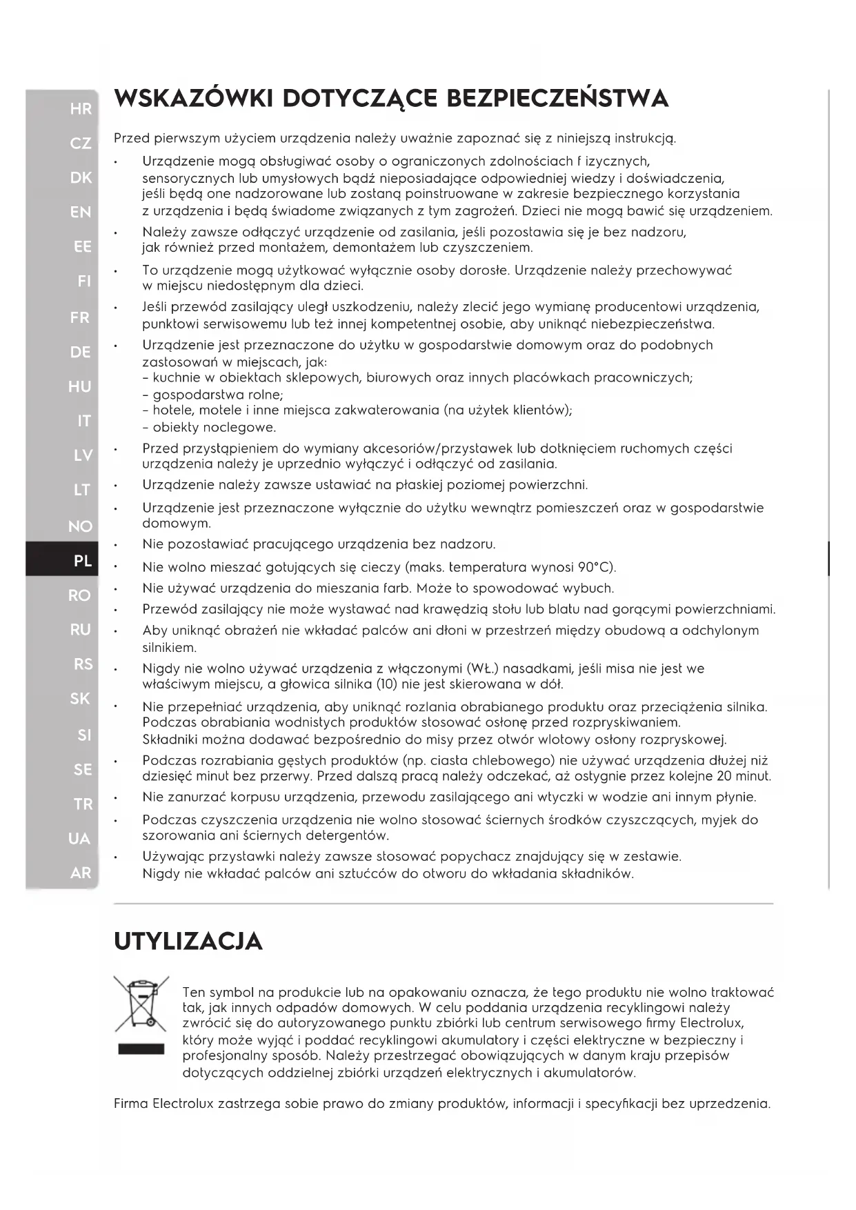 UTYLIZACJA Ten symbol na produkcie lub na opakowaniu oznacza, że tego produktu nie wolno traktować tak, jak innych odpadów domowych. W celu poddania urządzenia recyklingowi należy zwrócić się do autoryzowanego punktu zbiórki lub centrum serwisowego firmy Electrolux, który może wyjąć i poddać recyklingowi akumulatory i części elektryczne w bezpieczny i profesjonalny sposób. Należy przestrzegać obowiązujących w danym kraju przepisów dotyczących oddzielnej zbiórki urządzeń elektrycznych i akumulatorów. Firma Electrolux zastrzega sobie prawo do zmiany produktów, informacji i specyfikacji bez uprzedzenia.