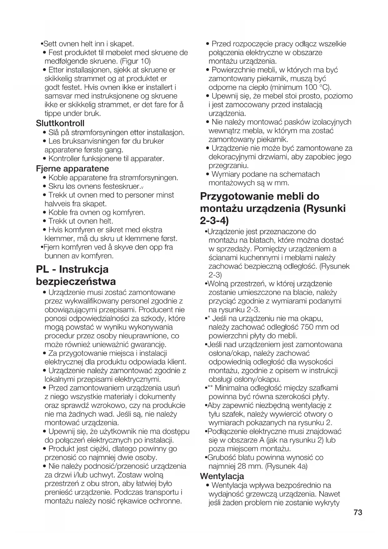 - Powierzchnie mebli, w których ma być zamontowany piekarnik, muszą być odporne na ciepło (minimum 100 °C).