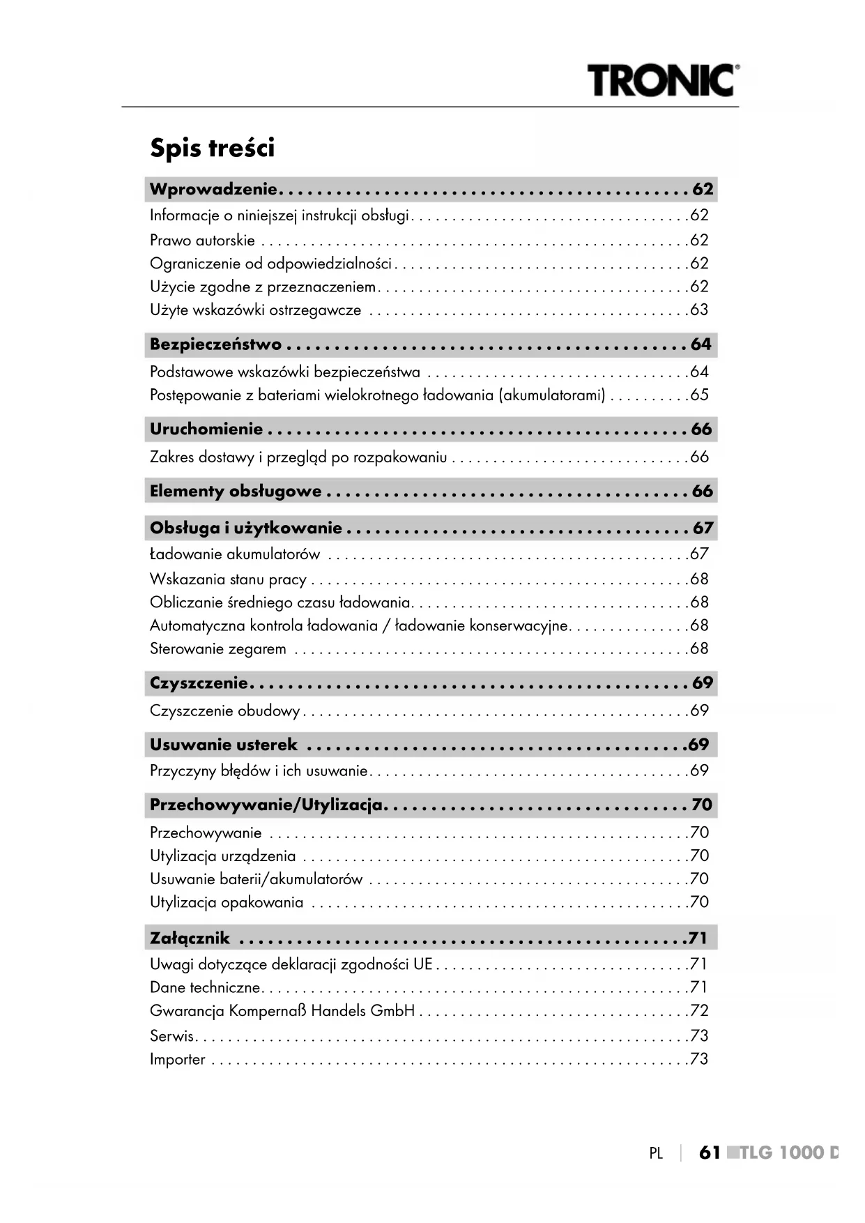 - 61 ■TLG 1000 D6 Spis treści Wprowadzenie p. 62