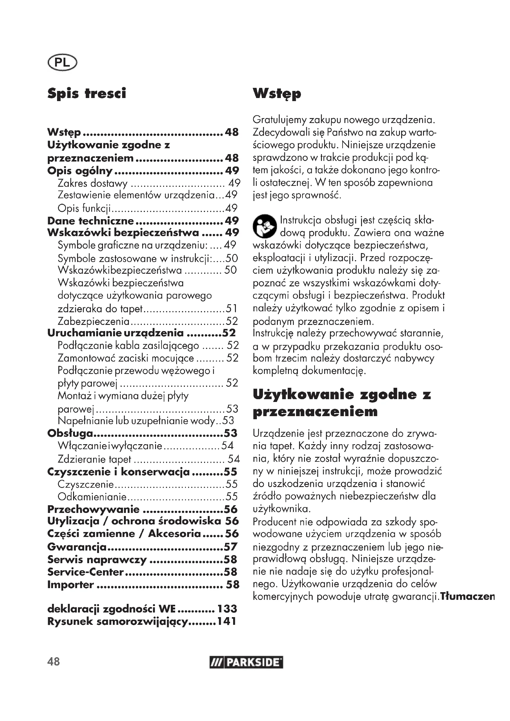 - Wstęp Gratulujemy zakupu nowego urządzenia. Zdecydowali się Państwo na zakup warto- ściowego produktu. Niniejsze urządzenie sprawdzono w trakcie produkcji pod ką- tem jakości, a także dokonano jego kontro- li ostatecznej. W ten sposób zapewniona jest jego sprawność. Instrukcja obsługi jest częścią skła- dową produktu. Zawiera ona ważne wskazówki dotyczące bezpieczeństwa, eksploatacji i utylizacji. Przed rozpoczę- ciem użytkowania produktu należy się za- poznać ze wszystkimi wskazówkami doty- czącymi obsługi i bezpieczeństwa. Produkt należy użytkować tylko zgodnie z opisem i podanym przeznaczeniem. Instrukcję należy przechowywać starannie, a w przypadku przekazania produktu oso- bom trzecim należy dostarczyć nabywcy kompletną dokumentację. Użytkowanie zgodne z przeznaczeniem Urządzenie jest przeznaczone do zrywa- nia tapet. Każdy inny rodzaj zastosowa- nia, który nie został wyraźnie dopuszczo- ny w niniejszej instrukcji, może prowadzić do uszkodzenia urządzenia i stanowić źródło poważnych niebezpieczeństw dla użytkownika. Producent nie odpowiada za szkody spo- wodowane użyciem urządzenia w sposób niezgodny z przeznaczeniem lub jego nie- prawidłową obsługą. Niniejsze urządze- nie nie nadaje się do użytku profesjonal- nego. Użytkowanie urządzenia do celów komercyjnych powoduje utratę gwarancji.Tłumaczenie oryginalnej deklaracji zgodności WE p. 133