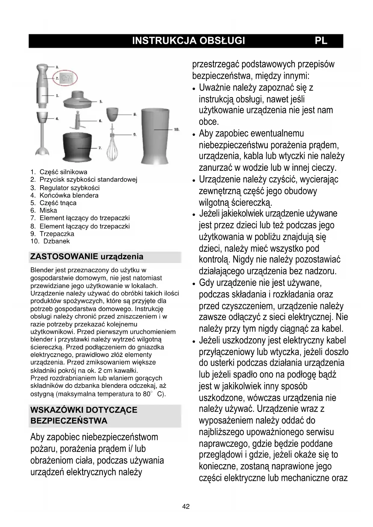 ZASTOSOWANIE urządzenia Blender jest przeznaczony do użytku w gospodarstwie domowym, nie jest natomiast przewidziane jego użytkowanie w lokalach. Urządzenie należy używać do obróbki takich ilości produktów spożywczych, które są przyjęte dla potrzeb gospodarstwa domowego. Instrukcję obsługi należy chronić przed zniszczeniem i w razie potrzeby przekazać kolejnemu użytkownikowi. Przed pierwszym uruchomieniem blender i przystawki należy wytrzeć wilgotną ściereczką. Przed podłączeniem do gniazdka elektrycznego, prawidłowo złóż elementy urządzenia. Przed zmiksowaniem większe składniki pokrój na ok. 2 cm kawałki. Przed rozdrabnianiem lub wlaniem gorących składników do dzbanka blendera odczekaj, aż ostygną (maksymalna temperatura to 80°C).