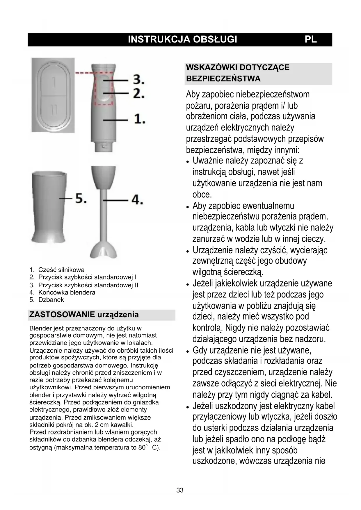 ZASTOSOWANIE urządzenia Blender jest przeznaczony do użytku w gospodarstwie domowym, nie jest natomiast przewidziane jego użytkowanie w lokalach. Urządzenie należy używać do obróbki takich ilości produktów spożywczych, które są przyjęte dla potrzeb gospodarstwa domowego. Instrukcję obsługi należy chronić przed zniszczeniem i w razie potrzeby przekazać kolejnemu użytkownikowi. Przed pierwszym uruchomieniem blender i przystawki należy wytrzeć wilgotną ściereczką. Przed podłączeniem do gniazdka elektrycznego, prawidłowo złóż elementy urządzenia. Przed zmiksowaniem większe składniki pokrój na ok. 2 cm kawałki. Przed rozdrabnianiem lub wlaniem gorących składników do dzbanka blendera odczekaj, aż ostygną (maksymalna temperatura to 80°C).