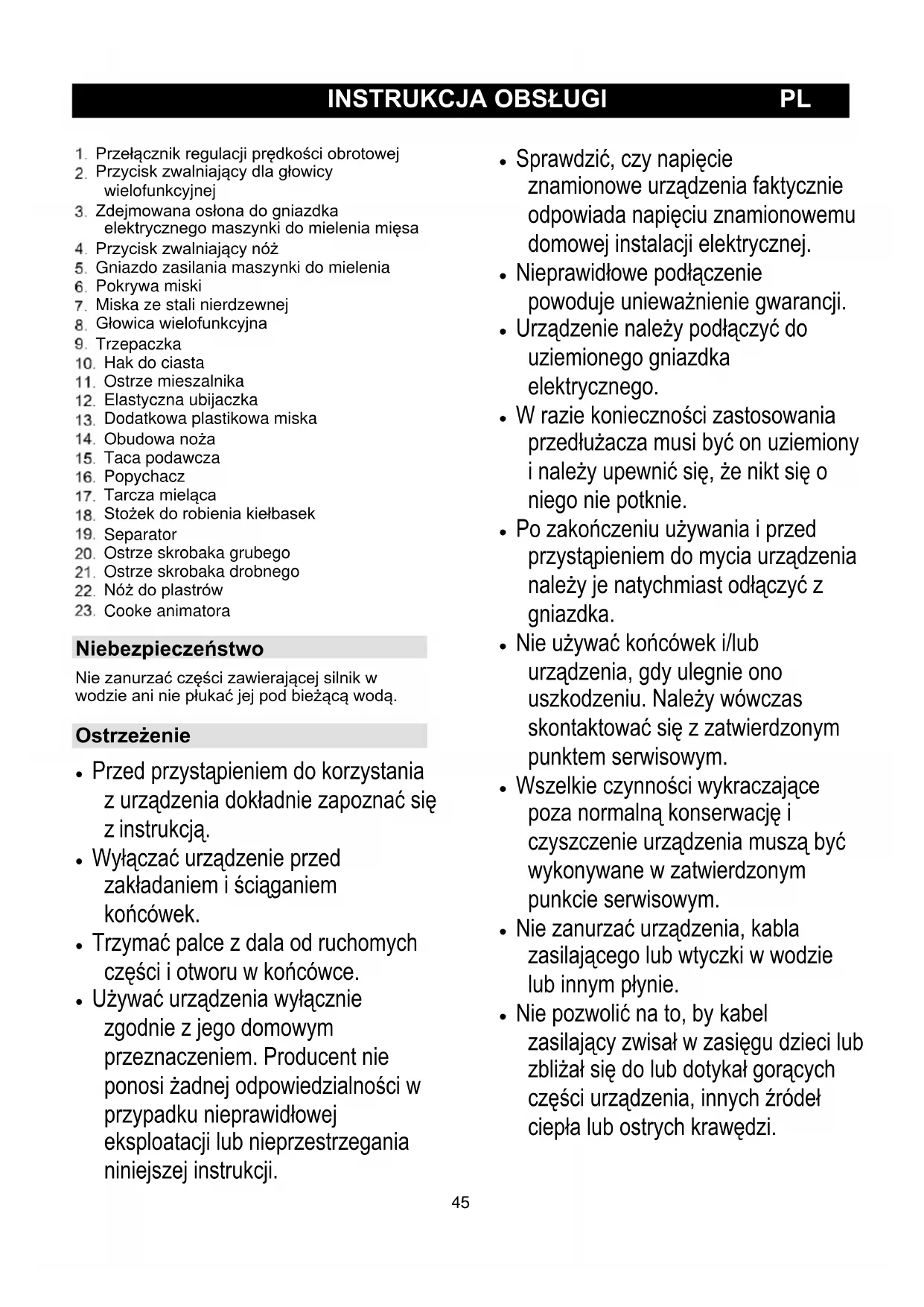 Przełącznik regulacji prędkości obrotowej Przycisk zwalniający dla głowicy wielofunkcyjnej Zdejmowana osłona do gniazdka elektrycznego maszynki do mielenia mięsa Przycisk zwalniający nóż Gniazdo zasilania maszynki do mielenia Pokrywa miski Miska ze stali nierdzewnej Głowica wielofunkcyjna Trzepaczka Hak do ciasta Ostrze mieszalnika Elastyczna ubijaczka Dodatkowa plastikowa miska Obudowa noża Taca podawcza Popychacz Tarcza mieląca Stożek do robienia kiełbasek Separator Ostrze skrobaka grubego Ostrze skrobaka drobnego Nóż do plastrów Cooke animatora Niebezpieczeństwo Nie zanurzać części zawierającej silnik w wodzie ani nie płukać jej pod bieżącą wodą. Ostrzeżenie