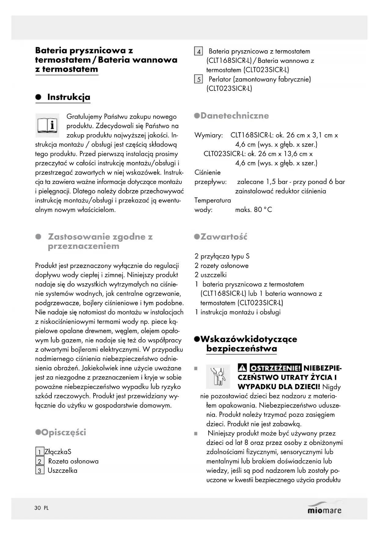 Perlator (zamontowany fabrycznie) (CLT023SICR-L) Dane techniczne Wymiary: CLT168SICR-L: ok. 26 cm x 3,1 cm x 4,6 cm (wys. x głęb. x szer.) CLT023SICR-L: ok. 26 cm x 13,6 cm x 4,6 cm (wys. x głęb. x szer.) Ciśnienie przepływu: zalecane 1,5 bar - przy ponad 6 bar zainstalować reduktor ciśnienia Temperatura wody: maks. 80 °C Zawartość 2 przyłącza typu S 2 rozety osłonowe 2 uszczelki 1 bateria prysznicowa z termostatem (CLT168SICR-L) lub 1 bateria wannowa z termostatem (CLT023SICR-L) 1 instrukcja montażu i obsługi Wskazówki dotyczące bezpieczeństwa NIEBEZPIE-