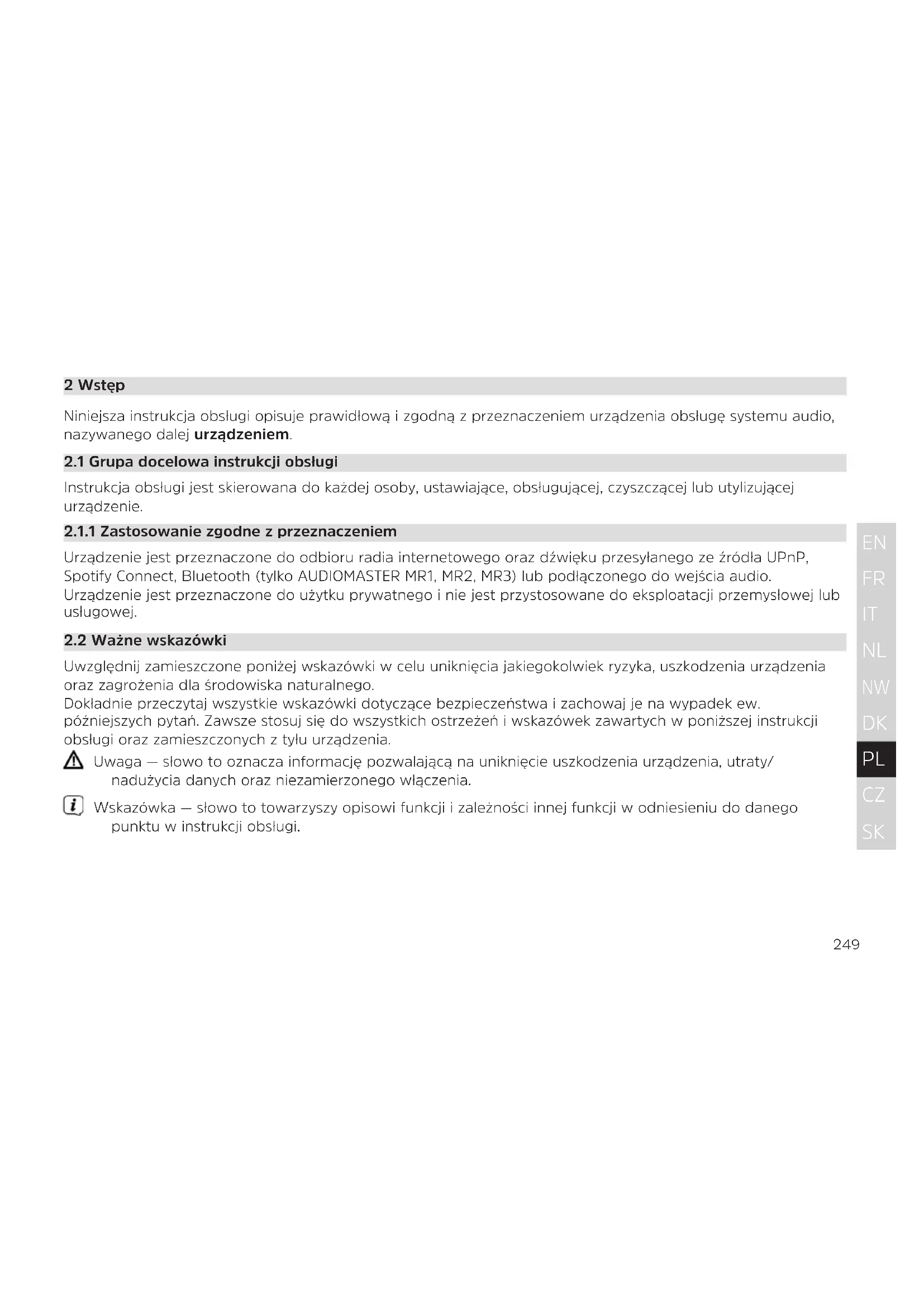 Urządzenie jest przeznaczone do odbioru radia internetowego oraz dźwięku przesyłanego ze źródła UPnP, Spotify Connect, Bluetooth (tylko AUDIOMASTER MR1, MR2, MR3) lub podłączonego do wejścia audio. Urządzenie jest przeznaczone do użytku prywatnego i nie jest przystosowane do eksploatacji przemysłowej lub usługowej.