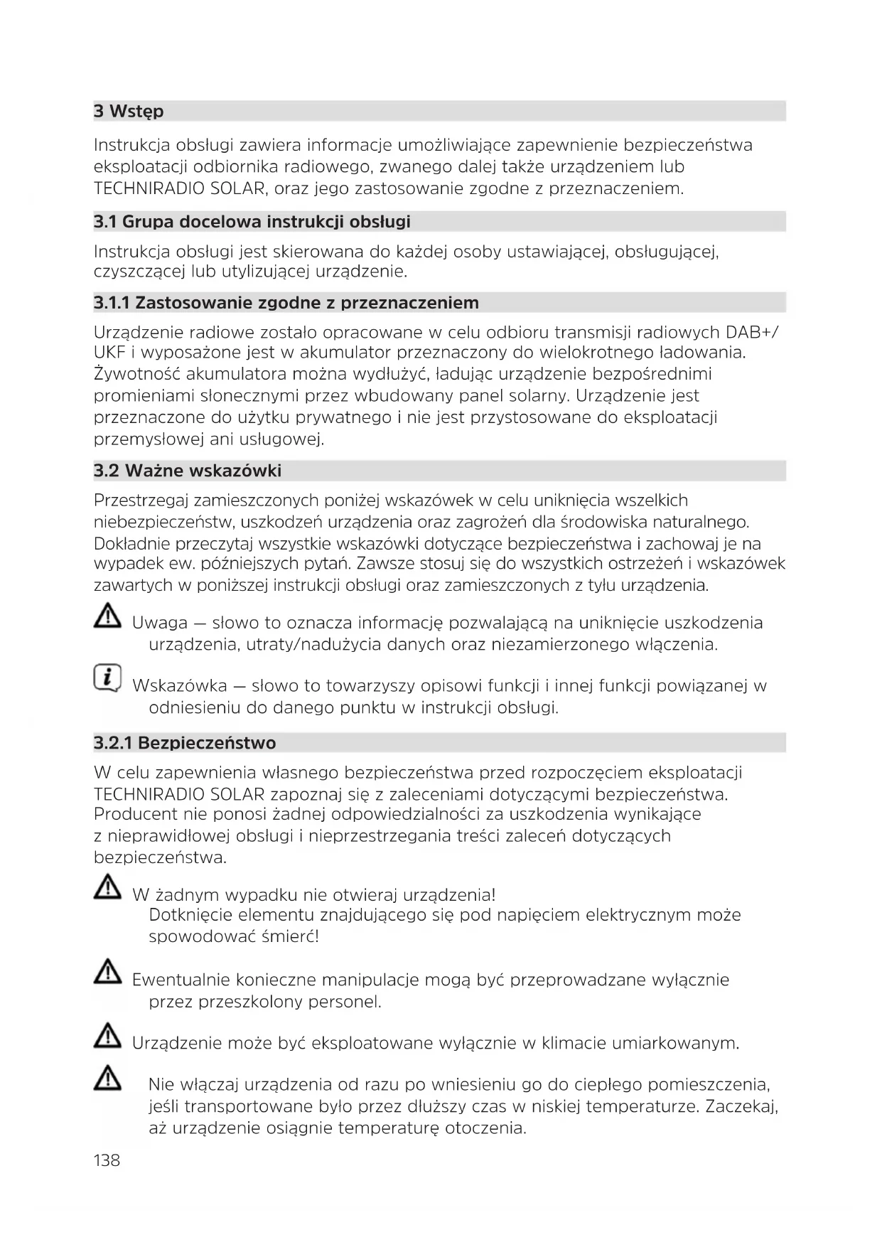 W celu zapewnienia własnego bezpieczeństwa przed rozpoczęciem eksploatacji TECHNIRADIO SOLAR zapoznaj się z zaleceniami dotyczącymi bezpieczeństwa. Producent nie ponosi żadnej odpowiedzialności za uszkodzenia wynikające z nieprawidłowej obsługi i nieprzestrzegania treści zaleceń dotyczących bezpieczeństwa. W żadnym wypadku nie otwieraj urządzenia! Dotknięcie elementu znajdującego się pod napięciem elektrycznym może spowodować śmierć! Ewentualnie konieczne manipulacje mogą być przeprowadzane wyłącznie przez przeszkolony personel. Urządzenie może być eksploatowane wyłącznie w klimacie umiarkowanym. Nie włączaj urządzenia od razu po wniesieniu go do ciepłego pomieszczenia, jeśli transportowane było przez dłuższy czas w niskiej temperaturze. Zaczekaj, aż urządzenie osiągnie temperaturę otoczenia.139