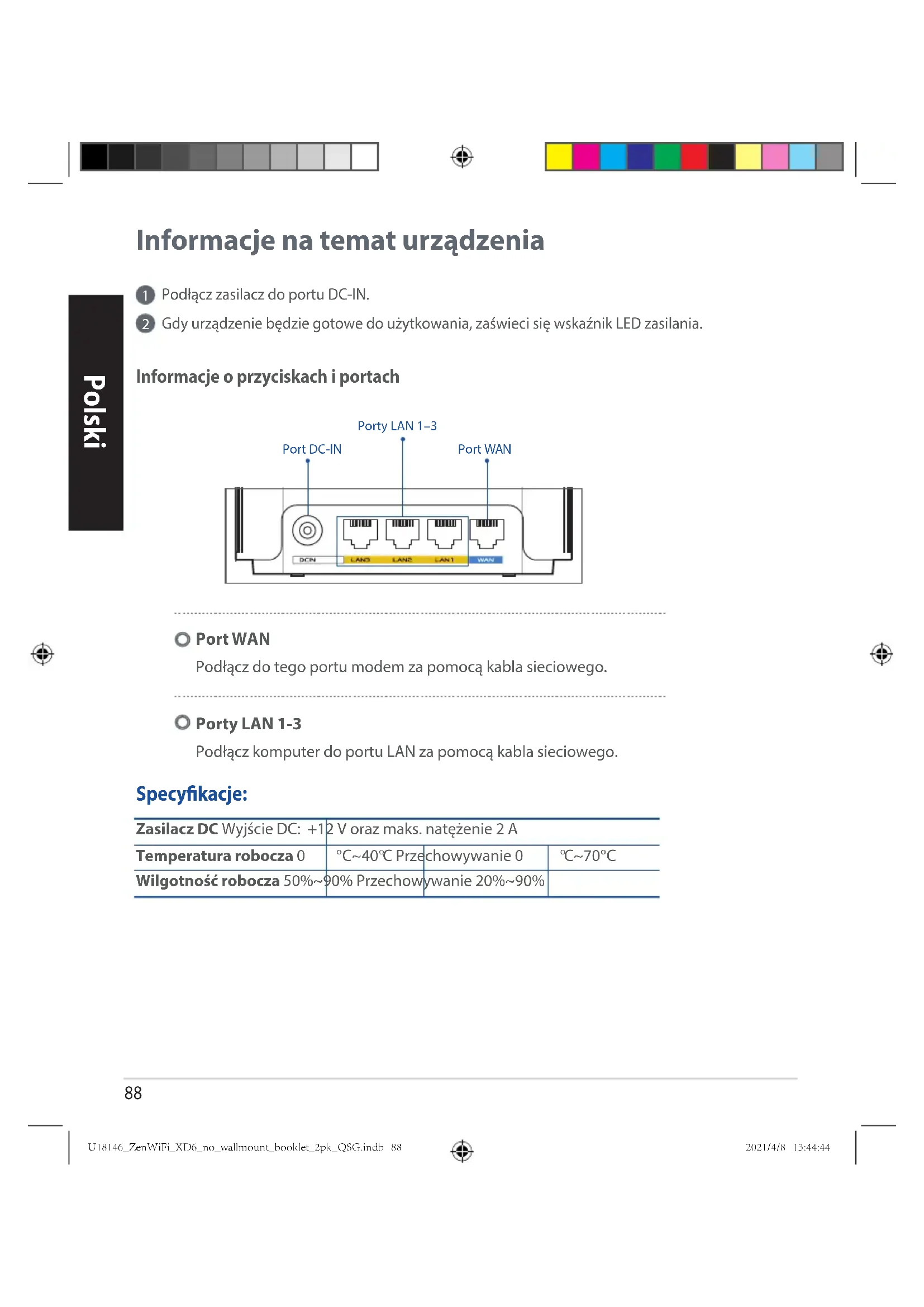 Wilgotność robocza 50%~90% Przechowywanie 20%~90% Specykacje: Informacje o przyciskach i portach Port WANPort DC-INPorty LAN 1–3 Port WAN Podłącz do tego portu modem za pomocą kabla sieciowego. Porty LAN 1-3 Podłącz komputer do portu LAN za pomocą kabla sieciowego. U18146_ZenWiFi_XD6_no_wallmount_booklet_2pk_QSG.indb 88U18146_ZenWiFi_XD6_no_wallmount_booklet_2pk_QSG.indb 88 2021/4/8 13:44:442021/4/8 13:44:4489 Polski Przed Konguracją Przygotowanie do konguracji systemu AiMesh WiFi