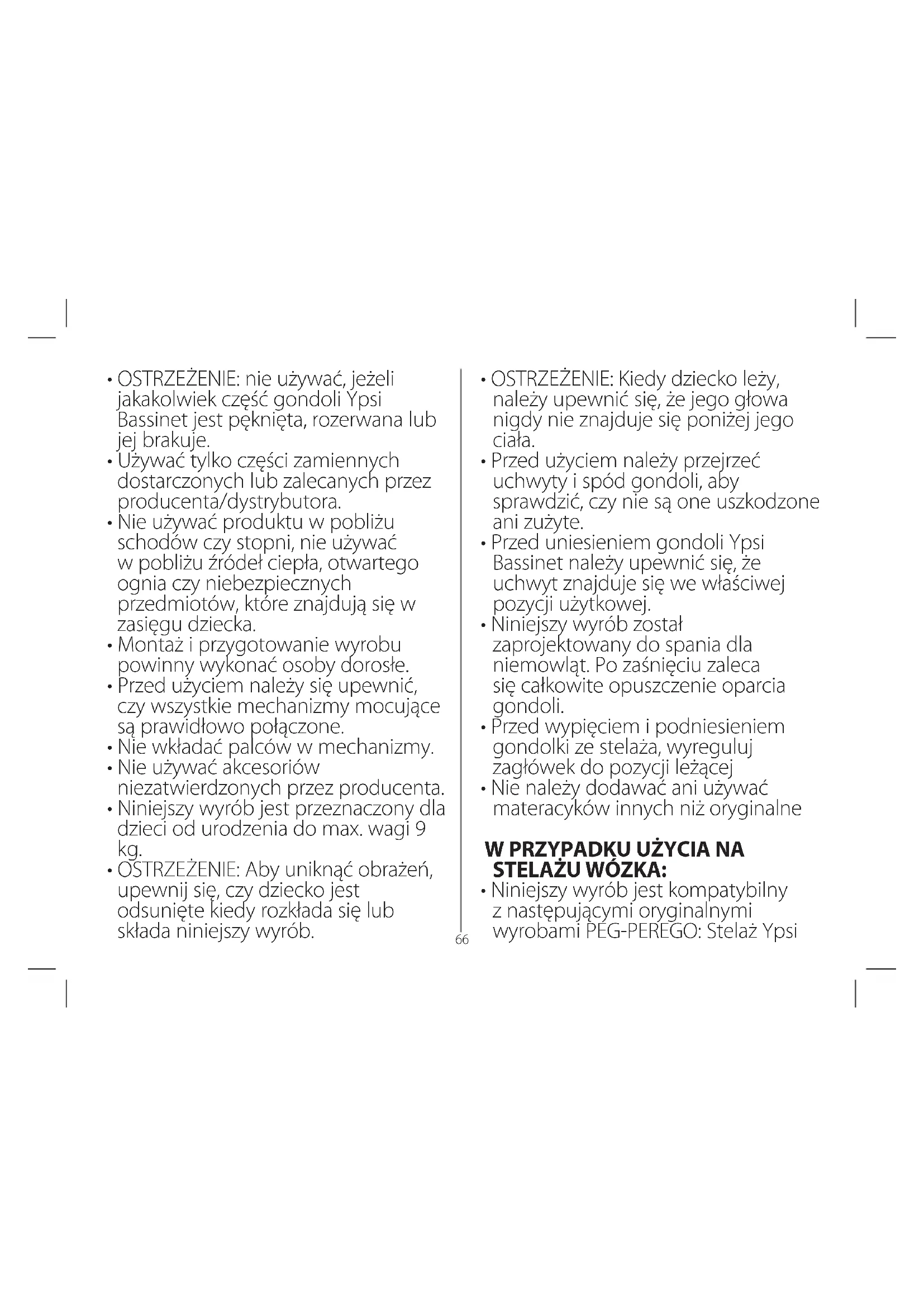 - OSTRZEŻENIE: Nie należy pozwalać innym dzieciom bawić się bez opieki w pobliżu gondoli czy podkładki. Obrazy odnoszące się do elementów z tkaniny mogą różnić się od zakupionej kolekcji. Aby uzyskać więcej informacji, prosimy odwiedzić naszą stronę internetową: www.pegperego.com Instrukcja obsługi 1 Obrócić uchwyt gondoli Ypsi Bassinet do góry, aż do "kliknięcia". 2 Wyjąć pokrowiec i materacyk. 3 Obrócić metalowy pręt do góry od strony głowy (rys_a) i unieść oparcie, jak pokazano na rysunku (rys_b). 4 Obrócić z powrotem metalowy pręt do dołu (rys_a) i zaczepić jego paski na odpowiednich zaczepach (rys_b). 5 Włożyć do otworu klamrę końcową paska regulującego różne kąty nachylenia oparcia. 6 Unieść oparcie (rys_a) i dosunąć metalowy drążek do zaczepów za pomocą paska (rys_b), a następnie zaczepić go (rys_c). 7 Opuścić siedzisko i zapiąć oba zamki błyskawiczne umieszczone na krawędzi gondoli. 8 Włożyć materacyk, pamiętając o tym, aby rozpinana strona pokrowca została skierowana w dół, a nie w górę, stykając się z dzieckiem. 9 BUDKA: Opuścić tylną część budki (rys_a) i zapiąć zamek błyskawiczny (rys_b). Można również wysunąć z budki daszek z tkaniny, aby chronić dziecko przed słońcem (rys_c) i prostym ruchem wsunąć go z powrotem do budki, gdy nie jest już on potrzebny. 10 POKROWIEC: ułożyć pokrowiec na gondoli Ypsi Bassinet i dopiąć go do wyściółki suwakiem, jak pokazano na rysunku. 11 Rzepy umożliwiają przymocowanie pokrowca do budki, gwarantując lepszą ochronę dziecka przed niekorzystnymi warunkami atmosferycznymi. Unieść koniec pokrowca (rys_a), wywinąć go do góry (rys_b) i przymocować rzepem do budki (fig_c). 12 Wywijanie pokrowca dzieli się na dwie oddzielne części. Rozpiąć zatrzask i opuścić klapę, aby ułatwić sprawdzenie. 13 UCHWYT: uchwyt jest zablokowany tylko wtedy, gdy znajduje się on w pozycji pionowej (rys_a). Aby go opuścić, należy nacisnąć jednocześnie oba przyciski boczne i obrócić go do dołu (rys_b). 14 Uchwyt jest przydatny do transportu i montażu gondoli Ypsi Bassinet na wózkach (rys_a). Aby podnieść gondolę, należy użyć rączki umieszczonej na uchwycie (rys_b). 15 REGULACJA OPARCIA: dzięki SYSTEMOWI COMFORT oparcie można regulować w 3 pozycjach poprzez pociągnięcie i zaczepienie paska regulacyjnego w pożądanej pozycji, jak pokazano na rysunku 16 SYSTEM CZTERY PORY ROKU: system ten pozwala regulować obieg powietrza wewnętrznego, aby uniknąć68 powstawania kondensacji. Aby przeprowadzić regulację, należy podnieść siedzisko (rys_a) i wyjąć panel obiegu powietrza (rys_b). 17 Przekręcić panel obiegu powietrza (rys_a) tak, aby jego otwory pokrywały się lub nie z otworami w dolnej części gondoli. Jeśli się one pokrywają, to powietrze przepływa. Na koniec włożyć panel do siedziska (rys_b). SYSTEM T-MATIC 18 System T-Matic to praktyczny i szybki system, który pozwala na zaczepienie gondoli Ypsi Bassinet na stelażu Ypsi Chassis za pomocą zaczepów T-MATIC. 19 Aby odczepić gondolę Ypsi Bassinet, należy pociągnąć za uchwyt z tyłu (rys_a) i unieść ją (rys_b). Zdejmowanie pokrowca 20 Zdjąć pokrowiec, odpinając zamek błyskawiczny, który przytwierdza go do wyściółki gondoli. 21 Wyciągnąć materacyk oraz wyjąć wyściółkę z pokrowca. 22 Odpiąć suwak, który przytwierdza budkę do wyściółki gondoli (rys_a). Następnie nacisnąć oba przyciski umieszczone po bokach uchwytu i wyjąć budkę (rys_b). 23 Wyjąć wyściółkę, rozpinając zamek błyskawiczny, który przytwierdza ją do struktury gondoli. 24 Ściągnąć pasek regulujący różne kąty nachylenia oparcia. 25 Unieść oparcie (rys_a), a następnie wyjąć z niego materacyk, aż do uzyskania dostępu do dwóch dziurek, w które wsunięte są klamry końcowe pasa (rys_b) i wyjąć je (rys_c). 26 Zdjąć pasy (rys_a), a następnie wyjąć materacyk z oparcia (rys_b). Składanie 27 Zdjąć pokrowiec, budkę, materacyk oraz wewnętrzną osłonę. Unieść oparcie (rys_a), odczepić metalowy pręt i obrócić go do góry (rys_b). Opuścić oparcie, a następnie metalowy pręt. 28 Unieść siedzisko (rys_a) i odczepić pasek metalowego pręta (rys_b), po czym złożyć go (rys_c). Po opuszczeniu siedziska, gondola Ypsi Bassinet zostanie złożona. Numer seryjny 29 Pod bazą gondoli Ypsi Bassinet znajdują się wszystkie niezbędne informacje dotyczące produktu: nazwa, data produkcji oraz numer seryjny. Informacje te są potrzebne przy składaniu ewentualnych reklamacji. The Orgnal Accessory Peg Perego Akcesoria Peg-Perego zostały specjalnie zaprojektowane dla wygody i ułatwienia życia rodziców. Aby poznać bogatą ofertę akcesoriów odwiedź www.pegperego.com lub www. akord.poznan.pl. Konserwacja elementów tapıcerowanych