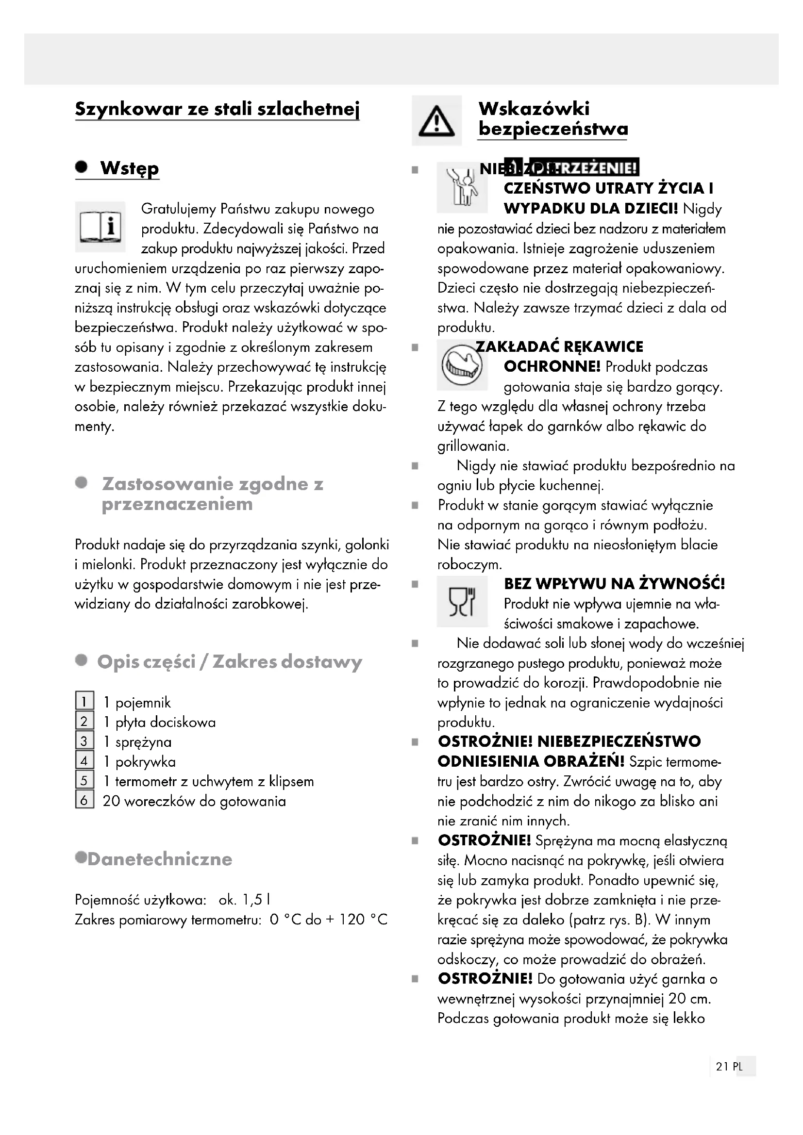 ODNIESIENIA OBRAŻEŃ! Szpic termome- tru jest bardzo ostry. Zwrócić uwagę na to, aby nie podchodzić z nim do nikogo za blisko ani nie zranić nim innych. OSTROŻNIE! Sprężyna ma mocną elastyczną siłę. Mocno nacisnąć na pokrywkę, jeśli otwiera się lub zamyka produkt. Ponadto upewnić się, że pokrywka jest dobrze zamknięta i nie prze- kręcać się za daleko (patrz rys. B). W innym razie sprężyna może spowodować, że pokrywka odskoczy, co może prowadzić do obrażeń. OSTROŻNIE! Do gotowania użyć garnka o wewnętrznej wysokości przynajmniej 20 cm. Podczas gotowania produkt może się lekko22 PL chwiać i pryskać gorąca woda. Zawsze należy postępować ostrożnie, ponieważ wskutek gorą- cej wody istnieje niebezpieczeństwo poparzenia się. OSTROŻNIE! Zwrócić uwagę na to, że po gotowaniu z pokrywki może wypływać gorący sok z mięsa. Jest to normalne. Nie przechylać produktu, aby uniknąć wyciekania soku z mięsa i poparzenia się nim. Użytkowanie Przed pierwszym użyciem umyć produkt ciepłą wodą, aby całkowicie usunąć wszystkie pozo- stałości poprodukcyjne. Następnie dobrze wypłukać produkt i dokładnie wysuszyć go. Umieścić woreczek do gotowania