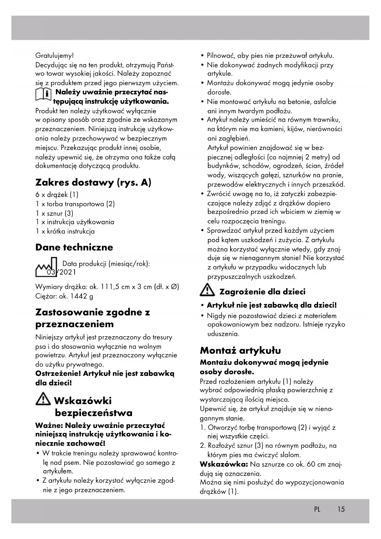 komórkowym / tabletem. Przechowywanie, czyszczenie Podczas nieużywania należy zawsze przecho- wywać produkt w suchym i czystym miejscu, w temperaturze pokojowej. WAŻNE! Nigdy nie czyścić ostrymi środkami czyszczącymi. Schować drążki (1) z założonymi zatyczkami zabezpieczającymi (1b) do torby transportowej (2). Uwagi odnośnie recyklingu Artykuł oraz materiały opakowaniowe należy usunąć zgodnie z aktualnymi przepisami obo- wiązującymi w danym miejscu. Materiały opakowaniowe, jak np. worki foliowe nie powinny znaleźć się w rękach dzieci. Materiał opakowaniowy należy przechowywać w miejscu niedostępnym dla dzieci. Zutylizować produkt i opakowanie w sposób przyjazny dla środowiska. Kod materiału do recyklingu służy do oznaczenia różnych materiałów przeznaczonych do zwrotu do przetwór- stwa wtórnego (recyklingu). Kod składa się z symbolu, który powinien odzwierciedlać cykl odzysku, oraz numeru oznaczającego materiał. Wskazówki dotyczące gwa- rancji i obsługi serwisowej Produkt został wyprodukowany bardzo staran- nie i podczas stałej kontroli. Państwo otrzymują na ten produkt trzy lata gwarancji od daty zakupu. Prosimy o zachowanie paragonu. Gwarancja obejmuje tylko błędy materiałowe lub fabryczne i traci ważność podczas używa- nia produktu nie właściwie i nie zgodnie z jego przeznaczeniem. Państwa prawa, w szczególno- ści zasady odpowiedzialności z tytułu rękojmi, nie zostaną ograniczone tą gwarancję. W razie ewentualnych reklamacji należy skontaktować się pod niżej podanym numerem infolinii lub poprzez pocztę elektroniczną. Nasi współpracownicy omówią z Państwem jak najszybciej dalszy przebieg sprawy.17 Z naszej strony gwarantujemy doradztwo. Czas gwarancji nie zostanie przedłużony przez ewentualnie podjęte naprawy na podstawie gwarancji, prawnej odpowiedzialności z tytułu rękojmi czy dokonania bezpłatnej naprawy. Dotyczy to również wymienionych i naprawio- nych części. Po upłynięciu czasu gwarancji powstałe naprawy są płatne. IAN: 353140_2007 Serwis Polska Tel.: 22 397 4996 E-Mail: deltasport@lidl.pl PL18 Srdečně blahopřejeme! Svým nákupem jste se rozhodli pro kvalitní výrobek. Před prvním použitím se prosím seznamte s tímto výrobkem. Pozorně si přečtete následující návod k použití. Používejte tento výrobek pouze tak, jak je popsáno, a pro uvedené účely. Uschovejte si tento návod k použití pro budoucí použití. Pokud výrobek předáte třetí osobě, předejte jí i vešker- ou dokumentaci. Rozsah dodávky (obr. A) 6 x tyč (1) 1 x taška na přepravu (2) 1 x vodicí šňůra (3) 1 x návod k použití 1 x krátký návod Technická data Datum výroby (měsíc/rok): 03/2021 Rozměry tyče: cca 111,5 cm x 3 cm (d x Ø) Váha: cca 1442 g Použití ke stanovenému účelu Tento výrobek je koncipován pro trénování psů a předpokládané použití jen na volném prostranství. Výrobek je určen pouze pro privátní potřebu. Upozornění! Výrobek není dětská hračka! Bezpečnostní pokyny Důležité upozornění: Pečlivě přečtěte tento návod k použití a bezpodmínečně ho uschovejte!