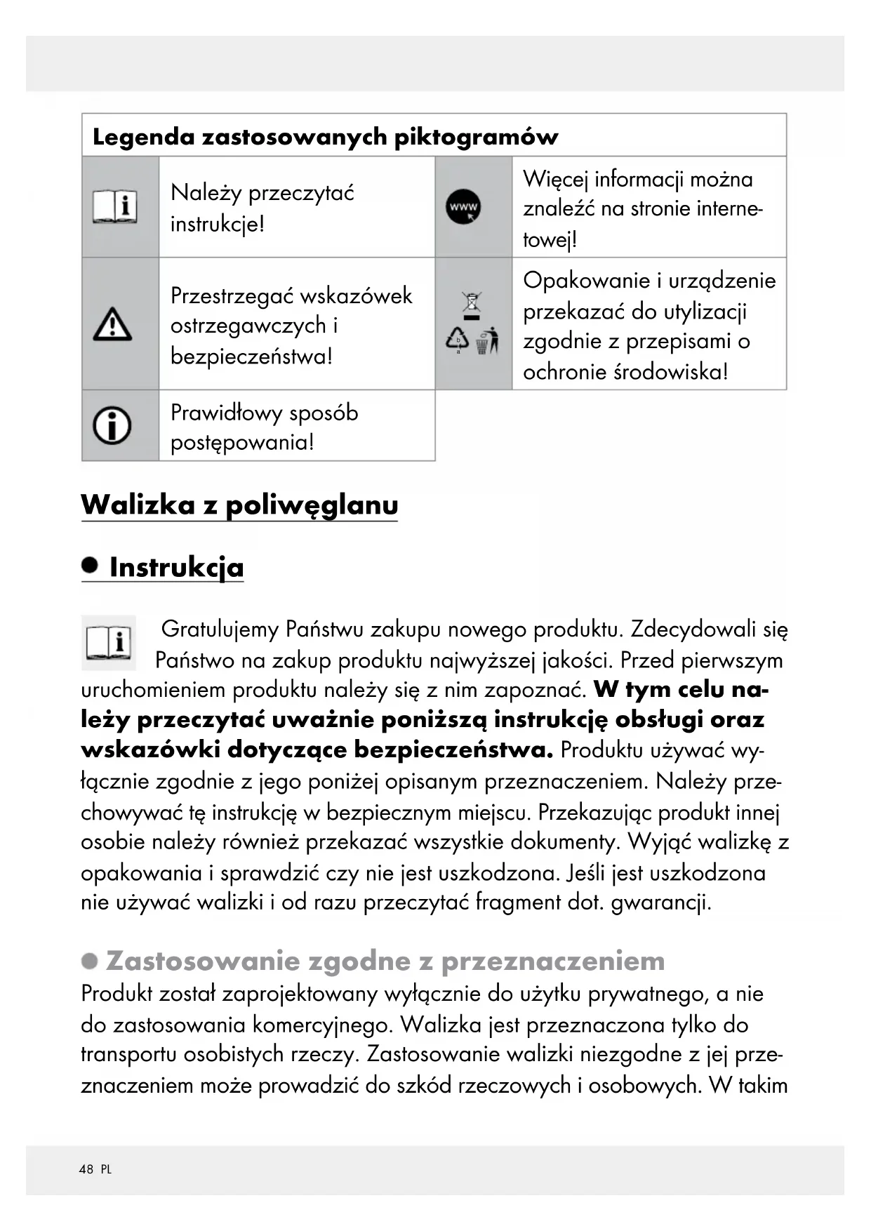 Opakowanie i urządzenie przekazać do utylizacji zgodnie z przepisami o ochronie środowiska! Prawidłowy sposób postępowania! Walizka z poliwęglanu Instrukcja Gratulujemy Państwu zakupu nowego produktu. Zdecydowali się Państwo na zakup produktu najwyższej jakości. Przed pierwszym uruchomieniem produktu należy się z nim zapoznać. W tym celu na- leży przeczytać uważnie poniższą instrukcję obsługi oraz wskazówki dotyczące bezpieczeństwa. Produktu używać wy- łącznie zgodnie z jego poniżej opisanym przeznaczeniem. Należy prze- chowywać tę instrukcję w bezpiecznym miejscu. Przekazując produkt innej osobie należy również przekazać wszystkie dokumenty. Wyjąć walizkę z opakowania i sprawdzić czy nie jest uszkodzona. Jeśli jest uszkodzona nie używać walizki i od razu przeczytać fragment dot. gwarancji. Zastosowanie zgodne z przeznaczeniem Produkt został zaprojektowany wyłącznie do użytku prywatnego, a nie do zastosowania komercyjnego. Walizka jest przeznaczona tylko do transportu osobistych rzeczy. Zastosowanie walizki niezgodne z jej prze- znaczeniem może prowadzić do szkód rzeczowych i osobowych. W takim49 PL przypadku producent lub dystrybutor nie ponosi odpowiedzialności za powstałe szkody. Walizka nie jest zabawką. Opis części