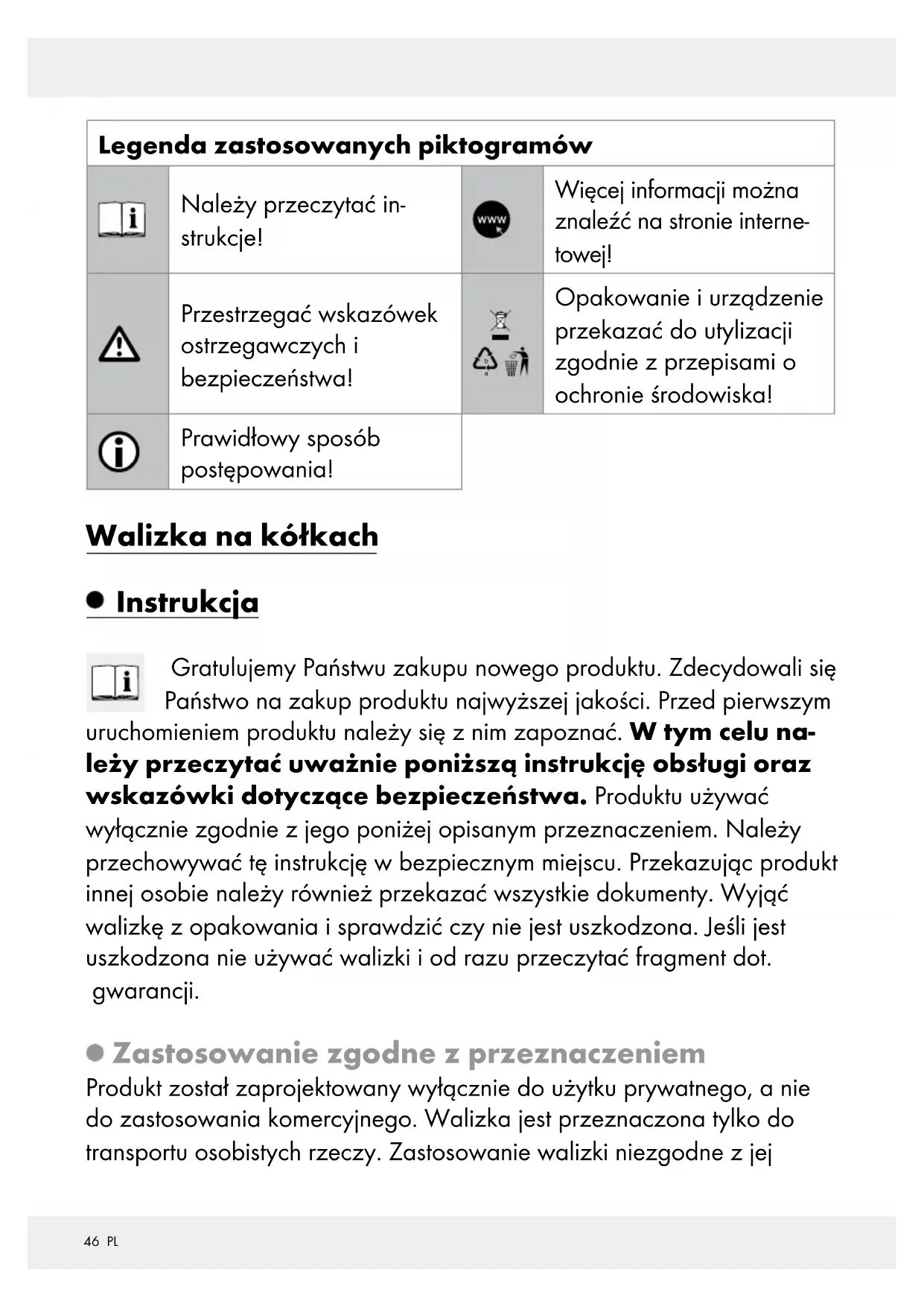 Opakowanie i urządzenie przekazać do utylizacji zgodnie z przepisami o ochronie środowiska! Prawidłowy sposób postępowania! Walizka na kółkach Instrukcja Gratulujemy Państwu zakupu nowego produktu. Zdecydowali się Państwo na zakup produktu najwyższej jakości. Przed pierwszym uruchomieniem produktu należy się z nim zapoznać. W tym celu na- leży przeczytać uważnie poniższą instrukcję obsługi oraz wskazówki dotyczące bezpieczeństwa. Produktu używać wyłącznie zgodnie z jego poniżej opisanym przeznaczeniem. Należy przechowywać tę instrukcję w bezpiecznym miejscu. Przekazując produkt innej osobie należy również przekazać wszystkie dokumenty. Wyjąć walizkę z opakowania i sprawdzić czy nie jest uszkodzona. Jeśli jest uszkodzona nie używać walizki i od razu przeczytać fragment dot. gwarancji. Zastosowanie zgodne z przeznaczeniem Produkt został zaprojektowany wyłącznie do użytku prywatnego, a nie do zastosowania komercyjnego. Walizka jest przeznaczona tylko do transportu osobistych rzeczy. Zastosowanie walizki niezgodne z jej47 PL przeznaczeniem może prowadzić do szkód rzeczowych i osobowych. W takim przypadku producent lub dystrybutor nie ponosi odpowiedzialności za powstałe szkody. Walizka nie jest zabawką. Opis części