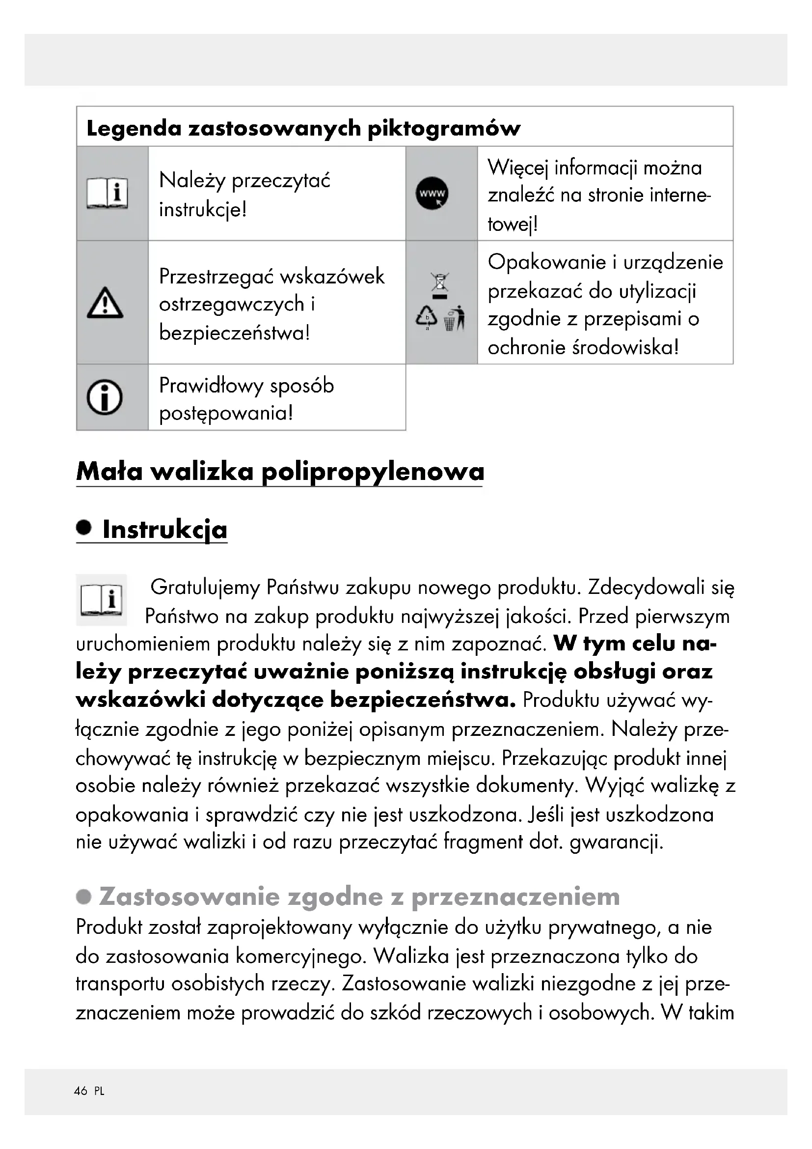 Opakowanie i urządzenie przekazać do utylizacji zgodnie z przepisami o ochronie środowiska! Prawidłowy sposób postępowania! Mała walizka polipropylenowa Instrukcja Gratulujemy Państwu zakupu nowego produktu. Zdecydowali się Państwo na zakup produktu najwyższej jakości. Przed pierwszym uruchomieniem produktu należy się z nim zapoznać. W tym celu na- leży przeczytać uważnie poniższą instrukcję obsługi oraz wskazówki dotyczące bezpieczeństwa. Produktu używać wy- łącznie zgodnie z jego poniżej opisanym przeznaczeniem. Należy prze- chowywać tę instrukcję w bezpiecznym miejscu. Przekazując produkt innej osobie należy również przekazać wszystkie dokumenty. Wyjąć walizkę z opakowania i sprawdzić czy nie jest uszkodzona. Jeśli jest uszkodzona nie używać walizki i od razu przeczytać fragment dot. gwarancji. Zastosowanie zgodne z przeznaczeniem Produkt został zaprojektowany wyłącznie do użytku prywatnego, a nie do zastosowania komercyjnego. Walizka jest przeznaczona tylko do transportu osobistych rzeczy. Zastosowanie walizki niezgodne z jej prze- znaczeniem może prowadzić do szkód rzeczowych i osobowych. W takim47 PL przypadku producent lub dystrybutor nie ponosi odpowiedzialności za powstałe szkody. Walizka nie jest zabawką. Opis części