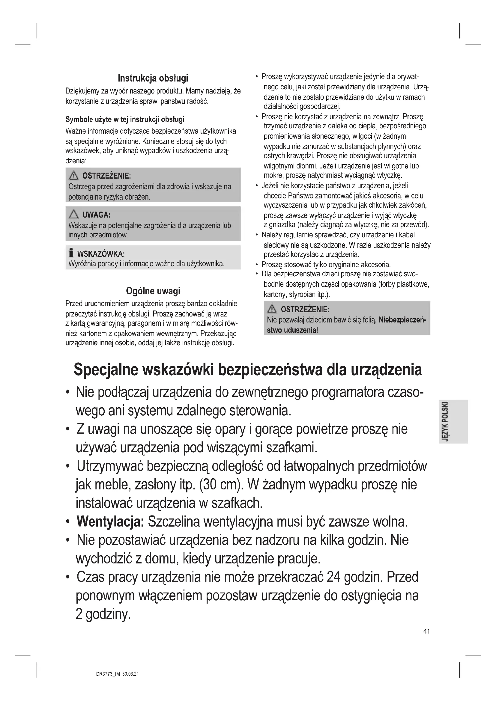 - Czas pracy urządzenia nie może przekraczać 24 godzin. Przed ponownym włączeniem pozostaw urządzenie do ostygnięcia na 2 godziny.DR3773_IM 30.03.21