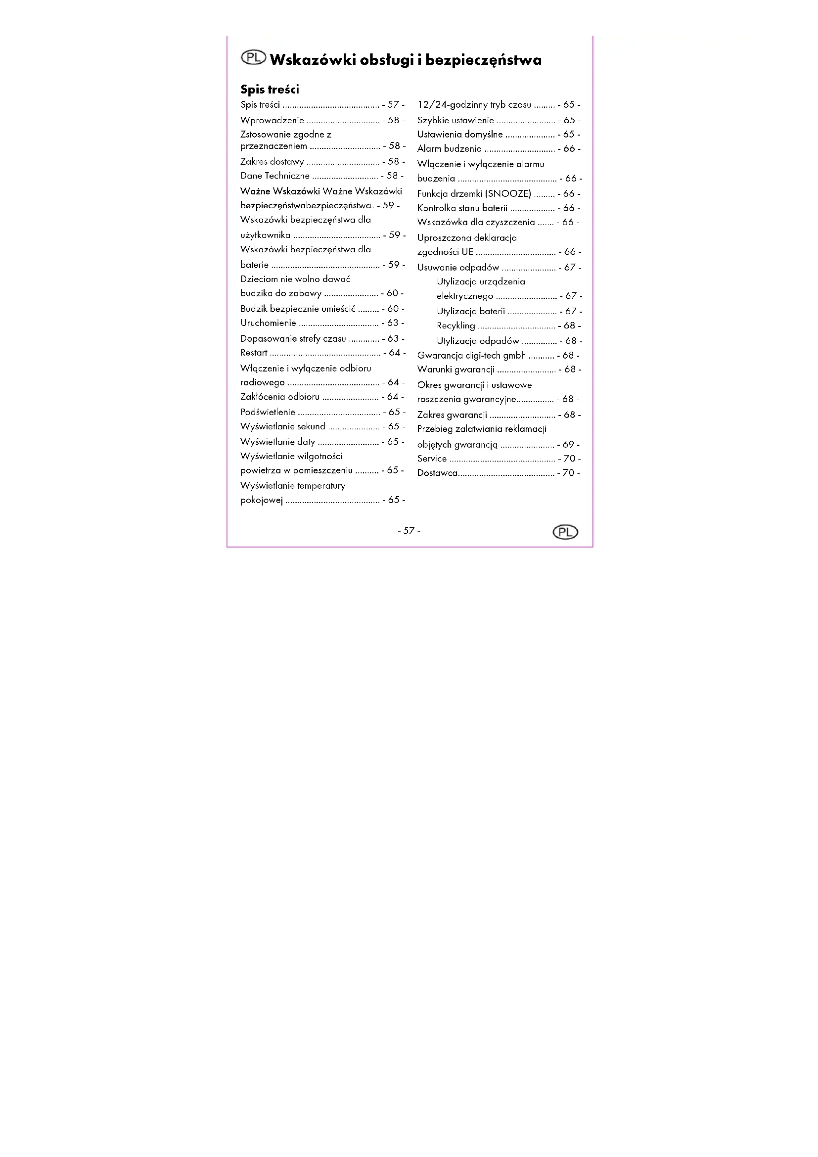 bezpieczęństwa bezpieczęństwabezpieczęństwa bezpieczęństwa ............................ - 59 - Wskazówki bezpieczęństwa dla użytkownika ..................................... - 59 - Wskazówki bezpieczęństwa dla baterie .............................................. - 59 - Dzieciom nie wolno dawać budzika do zabawy ....................... - 60 - Budzik bezpiecznie umieścić ......... - 60 - Uruchomienie .................................. - 63 - Dopasowanie strefy czasu ............. - 63 - Restart ............................................... - 64 - Włączenie i wyłączenie odbioru radiowego ....................................... - 64 - Zakłócenia odbioru ........................ - 64 - Podświetlenie ................................... - 65 - Wyświetlanie sekund ...................... - 65 - Wyświetlanie daty .......................... - 65 - Wyświetlanie wilgotności powietrza w pomieszczeniu .......... - 65 - Wyświetlanie temperatury pokojowej ........................................ - 65 - 12/24-godzinny tryb czasu ......... - 65 - Szybkie ustawienie ......................... - 65 - Ustawienia domyślne ..................... - 65 - Alarm budzenia .............................. - 66 - Włączenie i wyłączenie alarmu budzenia .......................................... - 66 - Funkcja drzemki (SNOOZE) ......... - 66 - Kontrolka stanu baterii ................... - 66 - Wskazówka dla czyszczenia ....... - 66 - Uproszczona deklaracja zgodności UE .................................. - 66 - Usuwanie odpadów ....................... - 67 - Utylizacja urządzenia elektrycznego .......................... - 67 - Utylizacja baterii ..................... - 67 - Recykling ................................. - 68 - Utylizacja odpadów ............... - 68 - Gwarancja digi-tech gmbh ........... - 68 - Warunki gwarancji ......................... - 68 - Okres gwarancji i ustawowe roszczenia gwarancyjne................ - 68 - Zakres gwarancji ............................ - 68 - Przebieg zalatwiania reklamacji objętych gwarancją ....................... - 69 - Service ............................................. - 70 - Dostawca......................................... - 70 --