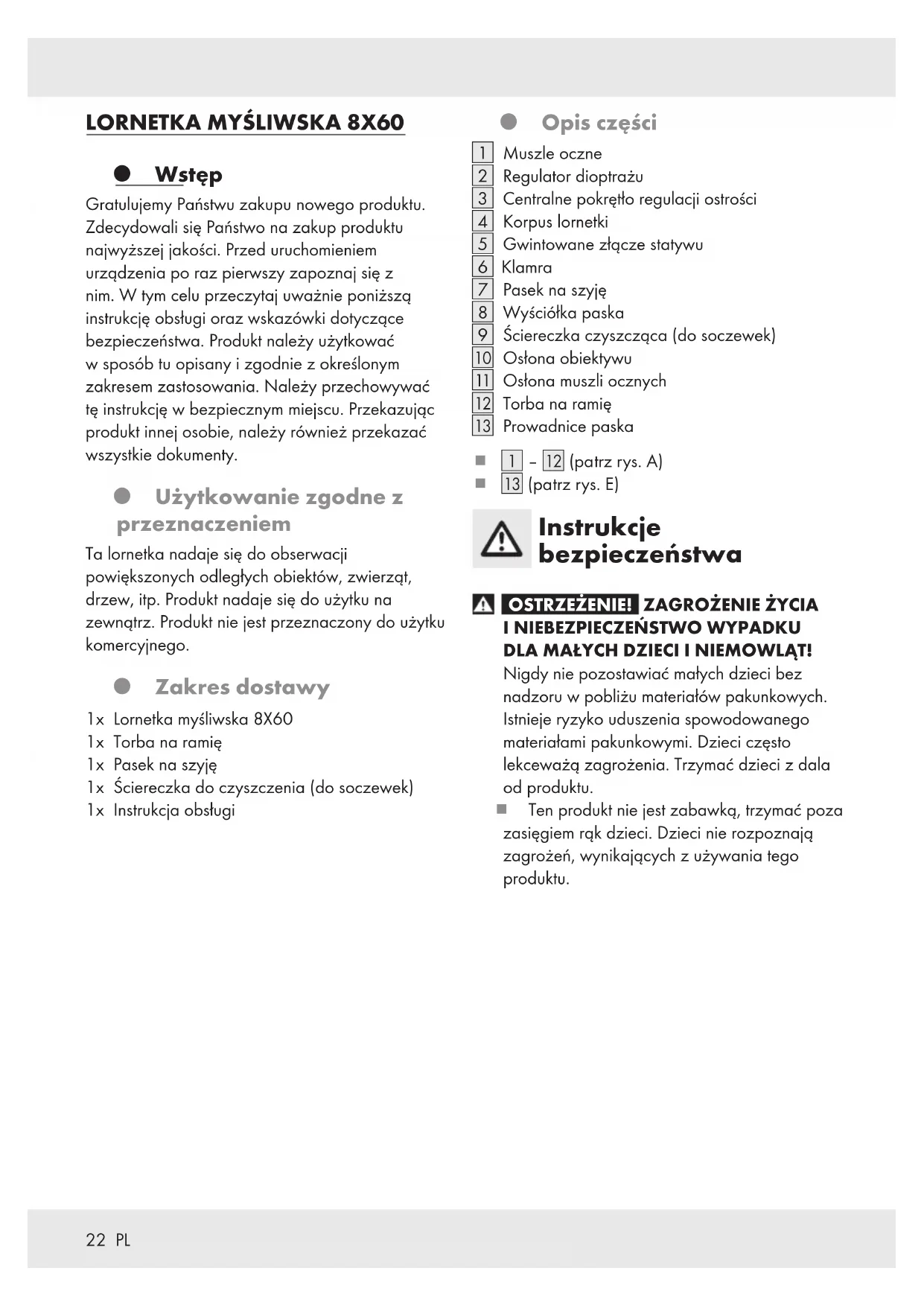 Wstęp Gratulujemy Państwu zakupu nowego produktu. Zdecydowali się Państwo na zakup produktu najwyższej jakości. Przed uruchomieniem urządzenia po raz pierwszy zapoznaj się z nim. W tym celu przeczytaj uważnie poniższą instrukcję obsługi oraz wskazówki dotyczące bezpieczeństwa. Produkt należy użytkować w sposób tu opisany i zgodnie z określonym zakresem zastosowania. Należy przechowywać tę instrukcję w bezpiecznym miejscu. Przekazując produkt innej osobie, należy również przekazać wszystkie dokumenty. Użytkowanie zgodne z przeznaczeniem Ta lornetka nadaje się do obserwacji powiększonych odległych obiektów, zwierząt, drzew, itp. Produkt nadaje się do użytku na zewnątrz. Produkt nie jest przeznaczony do użytku komercyjnego. Zakres dostawy 1x Lornetka myśliwska 8X60 1x Torba na ramię 1x Pasek na szyję 1x Ściereczka do czyszczenia (do soczewek) 1x Instrukcja obsługi Opis części [1] Muszle oczne [2] Regulator dioptrażu [3] Centralne pokrętło regulacji ostrości [4] Korpus lornetki [5] Gwintowane złącze statywu [6] Klamra [7] Pasek na szyję [8] Wyściółka paska [9] Ściereczka czyszcząca (do soczewek) [] Osłona obiektywu [] Osłona muszli ocznych [] Torba na ramię [] Prowadnice paska [1] ‒[] (patrz rys. A) [] (patrz rys. E) Instrukcje bezpieczeństwa