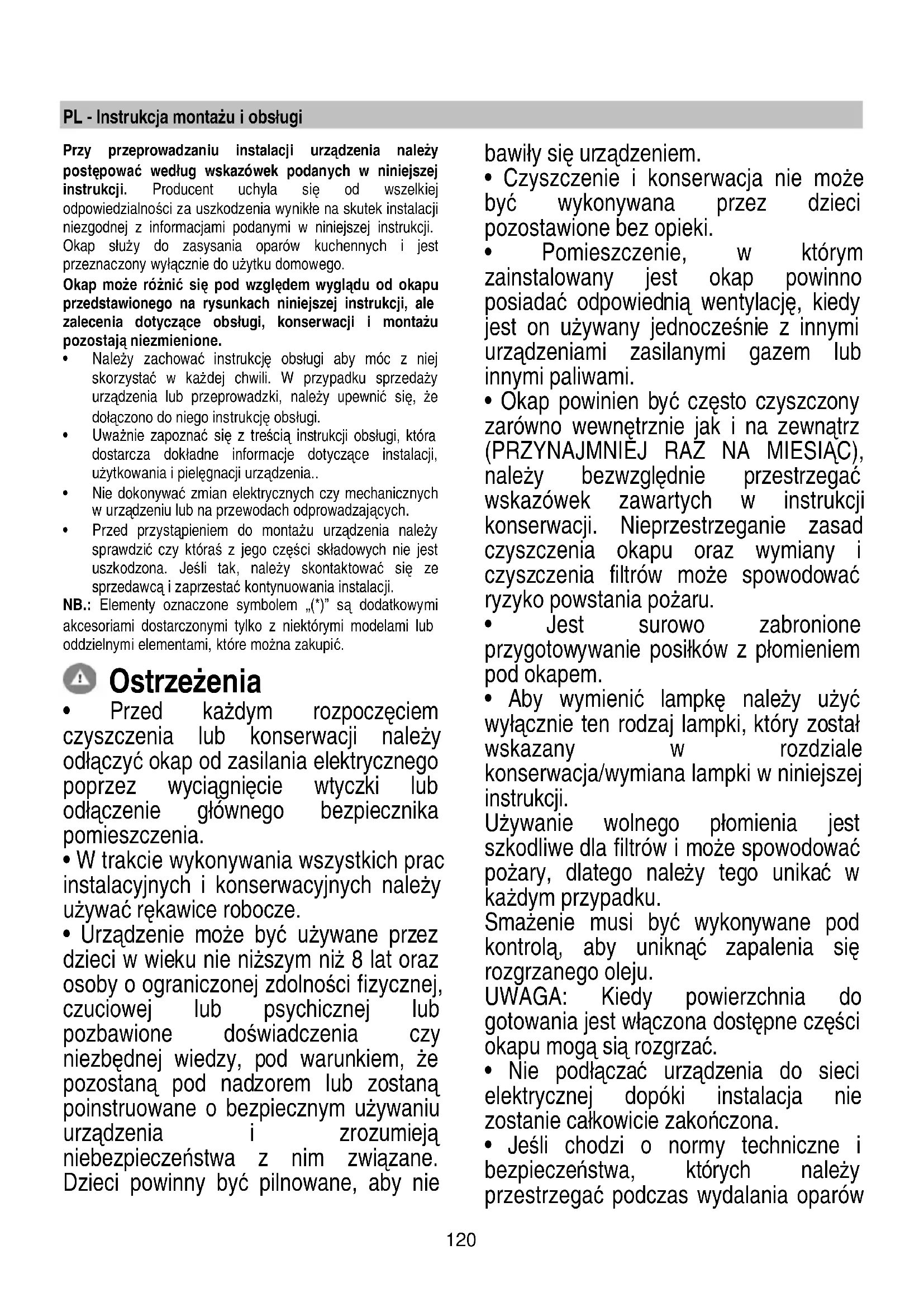 - Okap powinien być często czyszczony zarówno wewnętrznie jak i na zewnątrz (PRZYNAJMNIEJ RAZ NA MIESIĄC), należy bezwzględnie przestrzegać wskazówek zawartych w instrukcji konserwacji. Nieprzestrzeganie zasad czyszczenia okapu oraz wymiany i czyszczenia filtrów może spowodować ryzyko powstania pożaru.