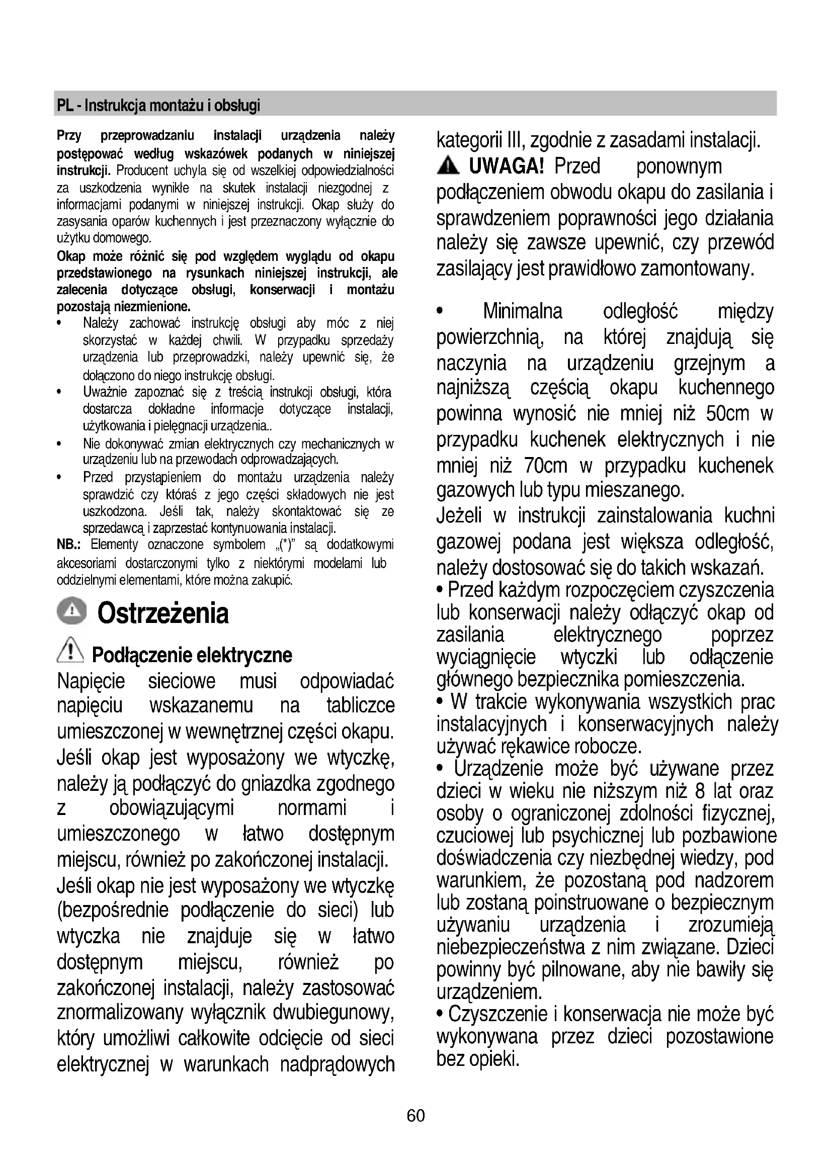 - Przed przystąpieniem do montażu urządzenia należy sprawdzić czy któraś z jego części składowych nie jest uszkodzona. Jeśli tak, należy skontaktować się ze sprzedawcą i zaprzestać kontynuowania instalacji. NB.: Elementy oznaczone symbolem „(*)” są dodatkowymi akcesoriami dostarczonymi tylko z niektórymi modelami lub oddzielnymi elementami, które można zakupić. Ostrzeżenia Podłączenie elektryczne Napięcie sieciowe musi odpowiadać napięciu wskazanemu na tabliczce umieszczonej w wewnętrznej części okapu. Jeśli okap jest wyposażony we wtyczkę, należy ją podłączyć do gniazdka zgodnego z obowiązującymi normami i umieszczonego w łatwo dostępnym miejscu, również po zakończonej instalacji. Jeśli okap nie jest wyposażony we wtyczkę (bezpośrednie podłączenie do sieci) lub wtyczka nie znajduje się w łatwo dostępnym miejscu, również po zakończonej instalacji, należy zastosować znormalizowany wyłącznik dwubiegunowy, który umożliwi całkowite odcięcie od sieci elektrycznej w warunkach nadprądowych kategorii III, zgodnie z zasadami instalacji. UWAGA! Przed ponownym podłączeniem obwodu okapu do zasilania i sprawdzeniem poprawności jego działania należy się zawsze upewnić, czy przewód zasilający jest prawidłowo zamontowany.