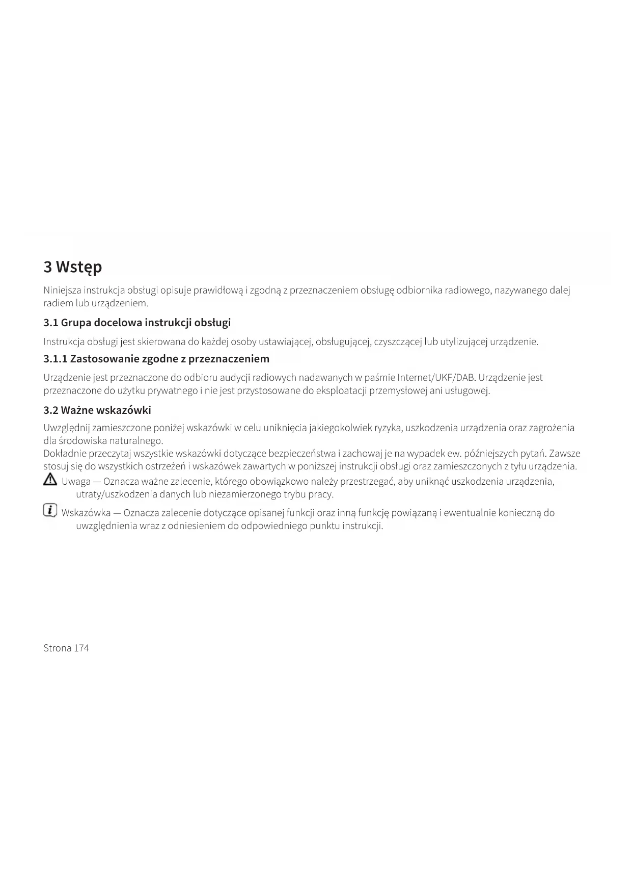 15 Czyszczenie .................................................................................214 16 Usuwanie usterek ............................................................................215 17 Dane techniczne / Wskazówki producenta .......................................................217Strona 174 3 Wstęp Niniejsza instrukcja obsługi opisuje prawidłową i zgodną z przeznaczeniem obsługę odbiornika radiowego, nazywanego dalej radiem lub urządzeniem.