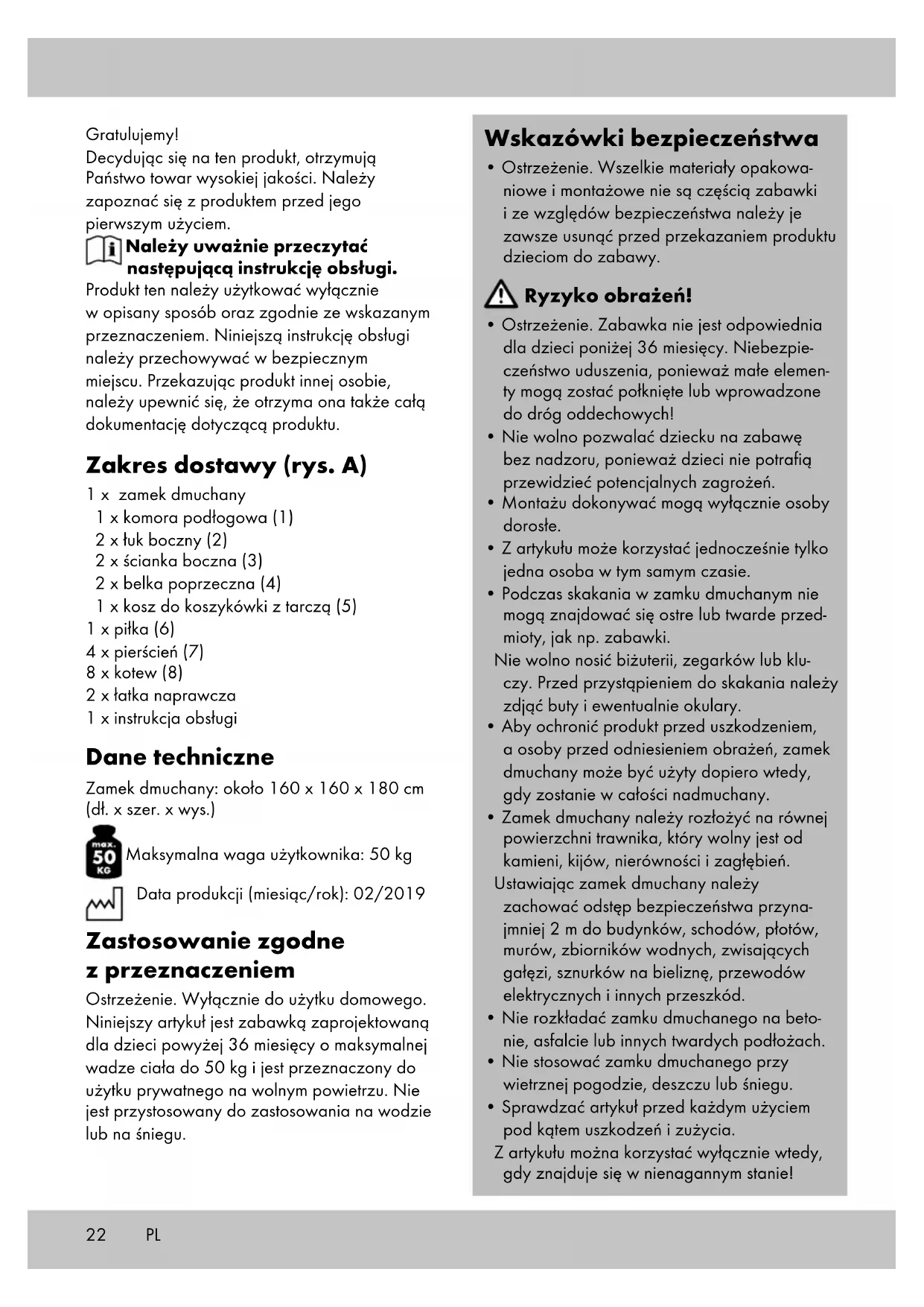 - Oderwać łatkę z papieru, położyć ją na uszkodzone miejsce i mocno docisnąć. Uwagi odnośnie recyklingu Artykuł oraz materiały opakowaniowe nale- ży usunąć zgodnie z aktualnymi przepisami obowiązującymi w danym miejscu. Materiały opakowaniowe, jak np. worki foliowe nie powinny znaleźć się w rękach dzieci. Materiał opakowaniowy należy przechowywać w miej- scu niedostępnym dla dzieci. Zutylizować produkt i opakowanie w sposób przyjazny dla środowiska. PL25PL Kod materiału do recyklingu służy do oznaczenia różnych materiałów przeznaczonych do zwrotu do przetwórstwa wtórnego (recyklingu). Kod składa się z symbolu, który powinien odzwierciedlać cykl odzysku, oraz numeru oznaczającego materiał. Wskazówki dotyczące gwa- rancji i obsługi serwisowej Produkt został wyprodukowany bardzo staran- nie i podczas stałej kontroli. Państwo otrzymują na ten produkt trzy lata gwarancji od daty zakupu. Prosimy o zachowanie paragonu. Gwarancja obejmuje tylko błędy materiałowe lub fabryczne i traci ważność podczas używa- nia produktu nie właściwie i nie zgodnie z jego przeznaczeniem. Państwa prawa, w szczególno- ści zasady odpowiedzialności z tytułu rękojmi, nie zostaną ograniczone tą gwarancję. W razie ewentualnych reklamacji należy skontaktować się pod niżej podanym numerem infolinii lub poprzez pocztę elektroniczną. Nasi współpracownicy omówią z Państwem jak najszybciej dalszy przebieg sprawy. Z naszej strony gwarantujemy doradztwo. Czas gwarancji nie zostanie przedłużony przez ewentualnie podjęte naprawy na podstawie gwarancji, prawnej odpowiedzialności z tytułu rękojmi czy dokonania bezpłatnej naprawy. Dotyczy to również wymienionych i naprawio- nych części. Po upłynięciu czasu gwarancji powstałe napra- wy są płatne. IAN: 311501 Serwis Polska Tel.: 22 397 4996 E-Mail: deltasport@lidl.pl26 Srdečně blahopřejeme! Svým nákupem jste se rozhodli pro kvalitní výrobek. Před prvním použitím se prosím seznamte s tímto výrobkem. Pozorně si přečtete následující návod k obsluze. Používejte tento výrobek pouze tak, jak je popsáno, a pro uvedené účely. Uschovejte si tento návod k obsluze pro budoucí použití. Pokud výrobek předáte třetí osobě, předejte jí i veškerou dokumentaci. Rozsah dodávky (obr. A) 1 x skákací hrad 1 x podlahová komora (1) 2 x boční oblouk (2) 2 x boční stěna (3) 2 x příčná opěra (4) 1 x basketbalový koš s cílovým terčem (5) 1 x míč (6) 4 x kruh (7) 8 x stanový kolík (8) 2 x záplata na opravu 1 x návod k obsluze Technická data Skákací hrad: cca 160 x 160 x 180 cm (d x š x v) Max. váha uživatele: 50 kg Datum výroby (měsíc/rok): 02/2019 Použití ke stanovenému účelu Upozornění. Jen pro domácí použití. Tento výrobek je hračka a byl vyvinut pro děti nad 36 měsíců s maximální vahou 50 kg pro privátní potřebu na venkovním prostranství. Není vhodný pro používání na vodě nebo na sněhu. Bezpečnostní pokyny