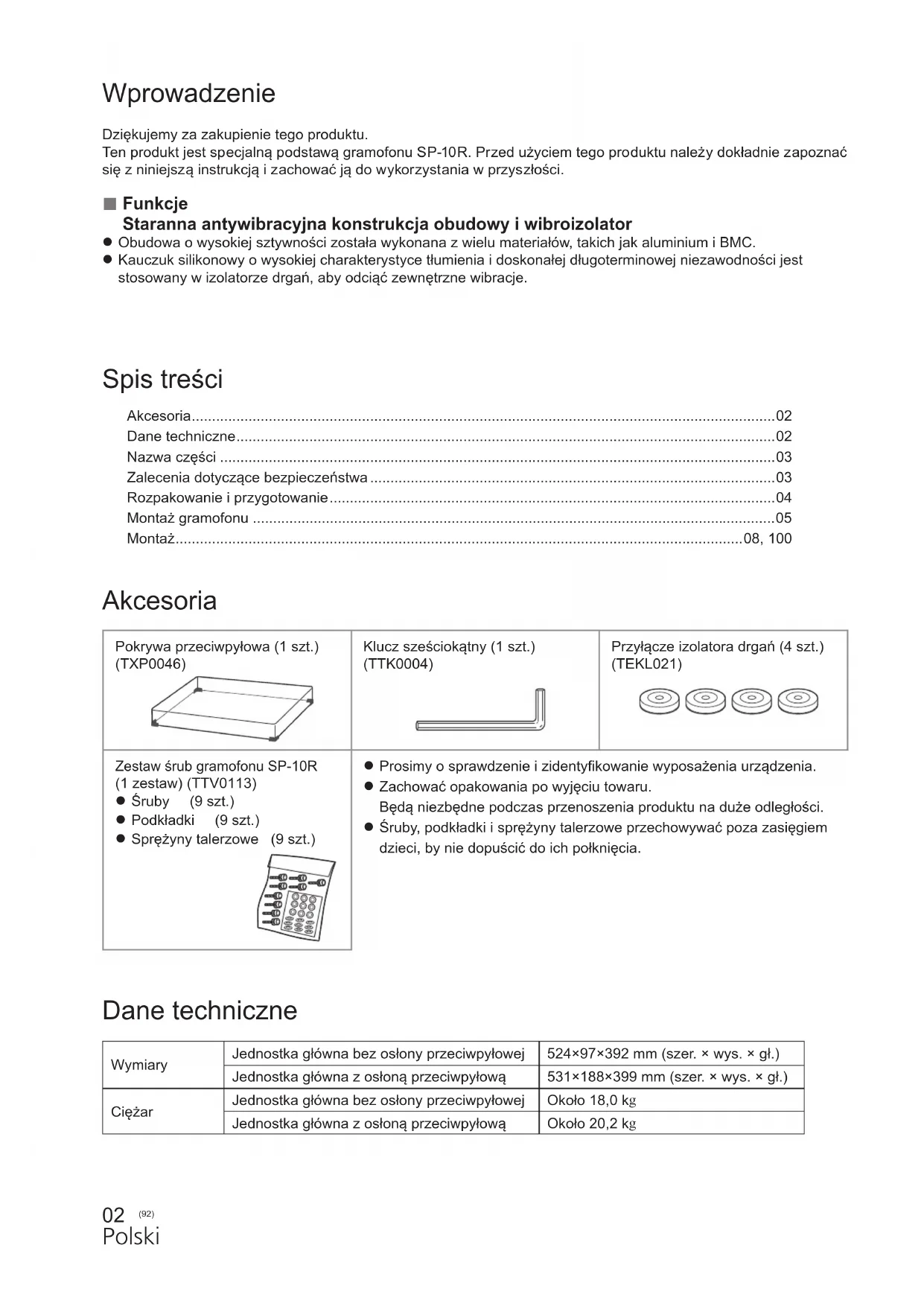 Kauczuk silikonowy o wysokiej charakterystyce tłumienia i doskonałej długoterminowej niezawodności jest stosowany w izolatorze drgań, aby odciąć zewnętrzne wibracje. Wprowadzenie Dziękujemy za zakupienie tego produktu. Ten produkt jest specjalną podstawą gramofonu SP-10R. Przed użyciem tego produktu należy dokładnie zapoznać się z niniejszą instrukcją i zachować ją do wykorzystania w przyszłości. Dane techniczne Wymiary Jednostka główna bez osłony przeciwpyłowej 524×97×392 mm (szer. × wys. × gł.) Jednostka główna z osłoną przeciwpyłową 531×188×399 mm (szer. × wys. × gł.) Ciężar Jednostka główna bez osłony przeciwpyłowej Około 18,0 k