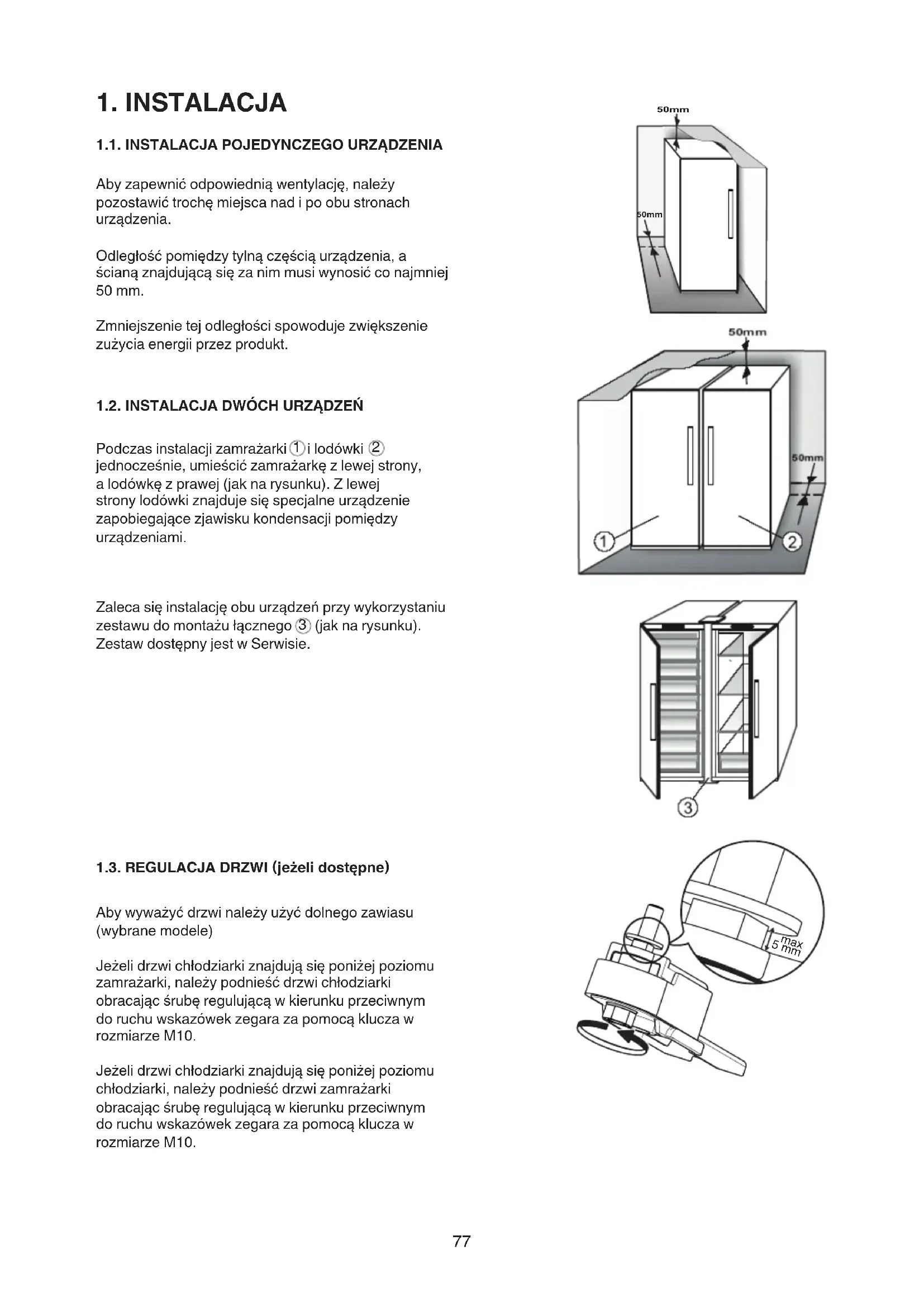(jaknarysunku). ZestawdostępnyjestwSerwisie. 1.3. REGULACJA DRZWI (jeżeli dostępne) Abywyważyćdrzwinależyużyćdolnegozawiasu (wybranemodele) Jeżelidrzwichłodziarkiznajdująsięponiżejpoziomu zamrażarki,należypodnieśćdrzwichłodziarki obracającśrubęregulującąwkierunkuprzeciwnym doruchuwskazówekzegarazapomocąkluczaw rozmiarzeM10. Jeżelidrzwichłodziarkiznajdująsięponiżejpoziomu chłodziarki,należypodnieśćdrzwizamrażarki obracającśrubęregulującąwkierunkuprzeciwnym doruchuwskazówekzegarazapomocąkluczaw rozmiarzeM10. 50mm 50mm 5 mm max78
