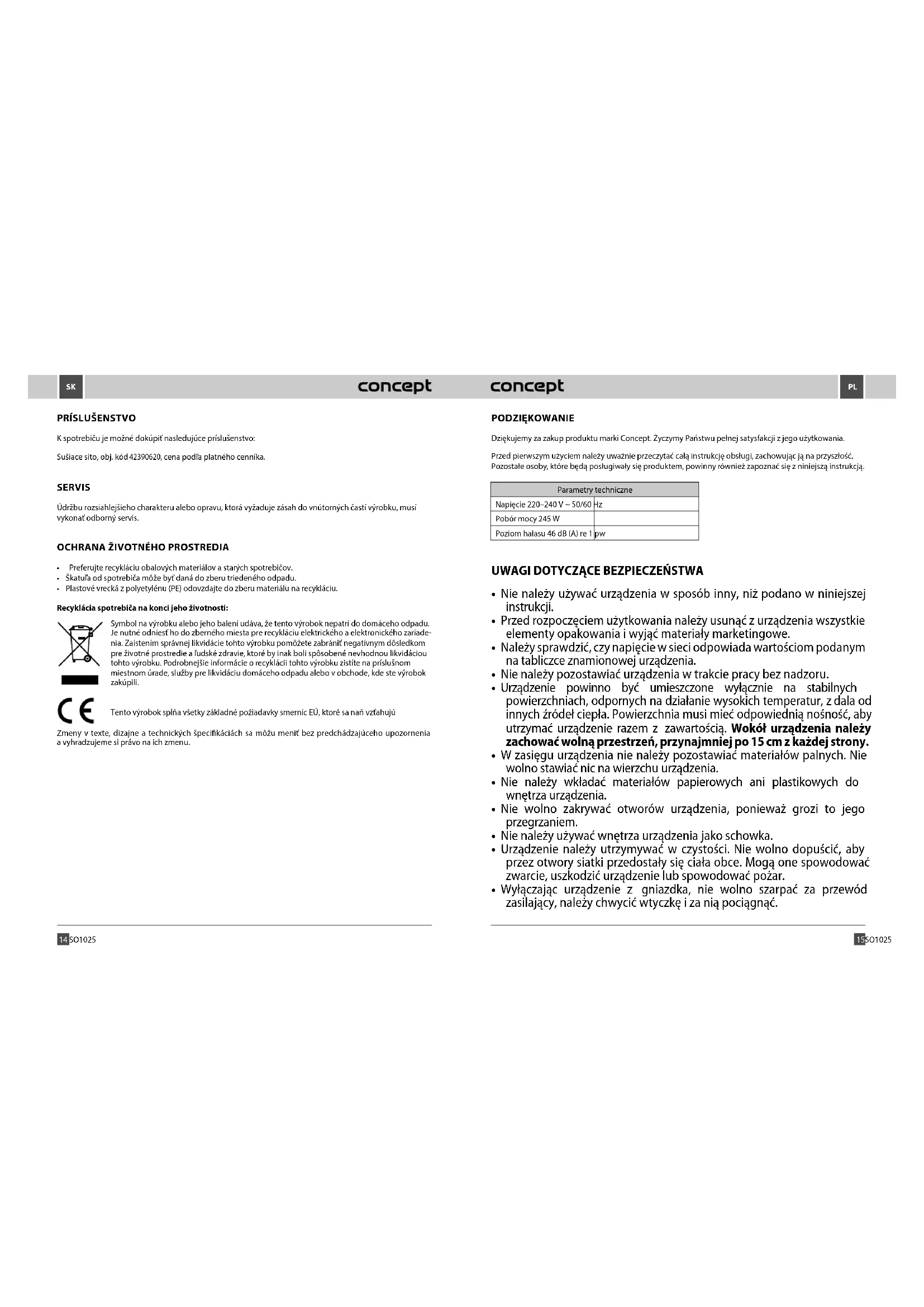 SO 1025 PODZIĘKOWANIE Dziękujemy za zakup produktu marki Concept. Życzymy Państwu pełnej satysfakcji z jego użytkowania. Przed pierwszym użyciem należy uważnie przeczytać całą instrukcję obsługi, zachowując ją na przyszłość. Pozostałe osoby, które będą posługiwały się produktem, powinny również zapoznać się z niniejszą instrukcją. Parametry techniczne Napięcie 220–240 V ~ 50/60 Hz Pobór mocy 245 W Poziom hałasu 46 dB (A) re 1 pw UWAGI DOTYCZĄCE BEZPIECZEŃSTWA: