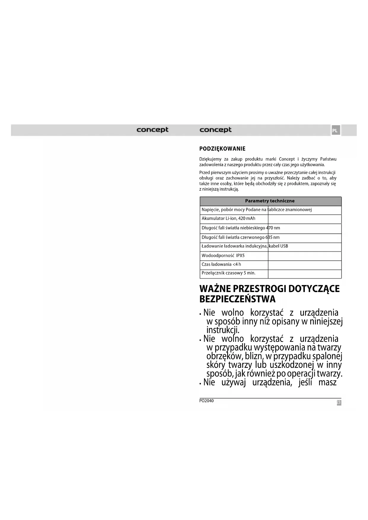 PO2040 PODZIĘKOWANIE Dziękujemy za zakup produktu marki Concept i życzymy Państwu zadowolenia z naszego produktu przez cały czas jego użytkowania. Przed pierwszym użyciem prosimy o uważne przeczytanie całej instrukcji obsługi oraz zachowanie jej na przyszłość. Należy zadbać o to, aby także inne osoby, które będą obchodziły się z produktem, zapoznały się zniniejszą instrukcją. Parametry techniczne Napięcie, pobór mocy Podane na tabliczce znamionowej Akumulator Li-ion, 420 mAh Długość fali światła niebieskiego 470 nm Długość fali światła czerwonego 635 nm Ładowanie ładowarka indukcyjna, kabel USB Wodoodporność IPX5 Czas ładowania <4 h Przełącznik czasowy 5 min.
