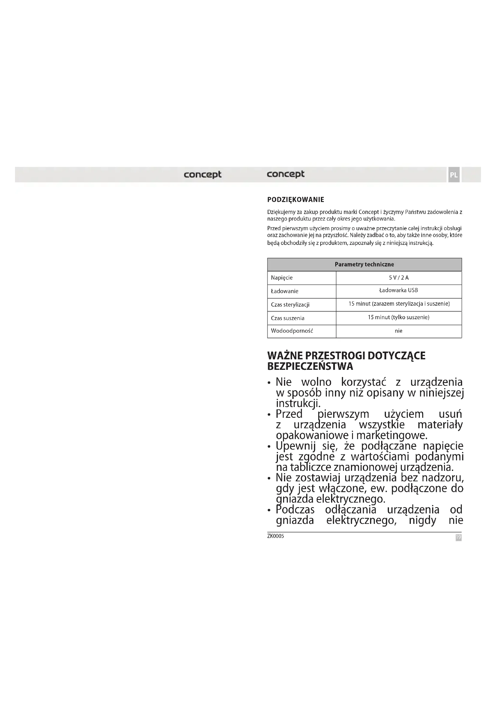 PODZIĘKOWANIE Dziękujemy za zakup produktu marki Concept i życzymy Państwu zadowolenia z naszego produktu przez cały okres jego użytkowania. Przed pierwszym użyciem prosimy o uważne przeczytanie całej instrukcji obsługi oraz zachowanie jej na przyszłość. Należy zadbać o to, aby także inne osoby, które będą obchodziły się z produktem, zapoznały się z niniejszą instrukcją. Parametry techniczne Napięcie 5 V / 2 A Ładowanie Ładowarka USB Czas sterylizacji 15 minut (zarazem sterylizacja i suszenie) Czas suszenia 15 minut (tylko suszenie) Wodoodporność nie