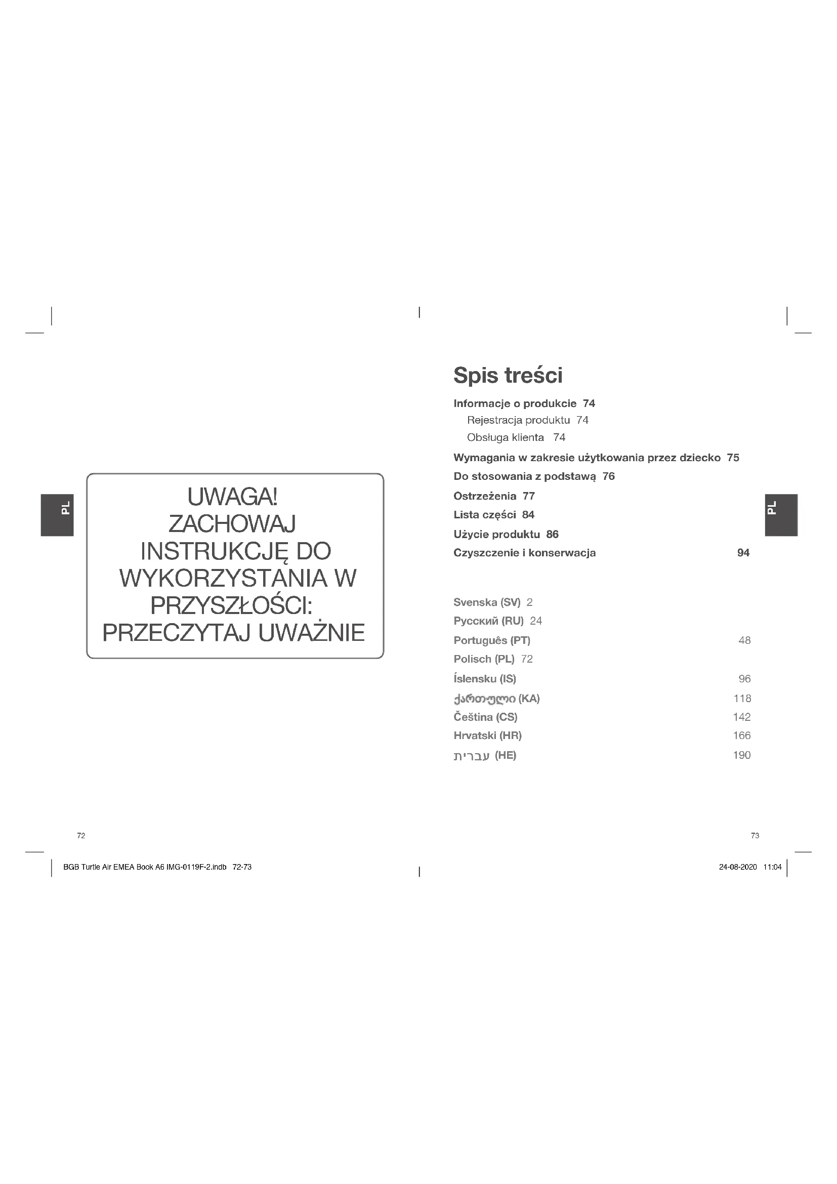 BGB Turtle Air EMEA Book A6 IMG-0119F-2.indb 70-71BGB Turtle Air EMEA Book A6 IMG-0119F-2.indb 70-71 24-08-2020 11:0424-08-2020 11:04Spis treści Informacje o produkcie 74 Rejestracja produktu 74 Obsługa klienta 74 Wymagania w zakresie użytkowania przez dziecko 75 Do stosowania z podstawą 76 Ostrzeżenia 77 Lista części 84 Użycie produktu 86 Czyszczenie i konserwacja 94 UWAGA! ZACHOWAJ INSTRUKCJĘ DO WYKORZYSTANIA W PRZYSZŁOŚCI: