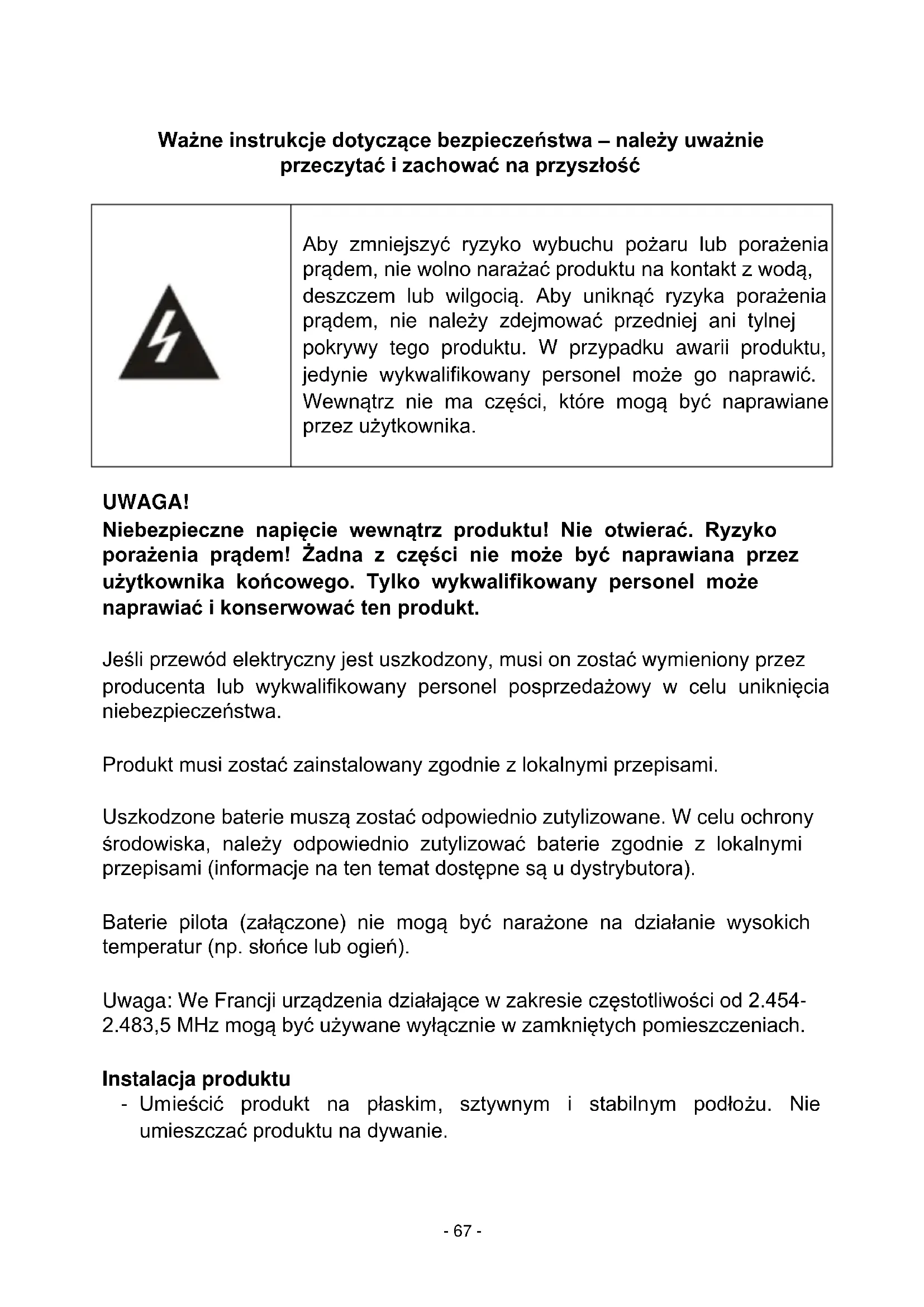 Aby zmniejszyć ryzyko wybuchu pożaru lub porażenia prądem, nie wolno narażać produktu na kontakt z wodą, deszczem lub wilgocią. Aby uniknąć ryzyka porażenia prądem, nie należy zdejmować przedniej ani tylnej pokrywy tego produktu. W przypadku awarii produktu, jedynie wykwalifikowany personel może go naprawić. Wewnątrz nie ma części, które mogą być naprawiane przez użytkownika.