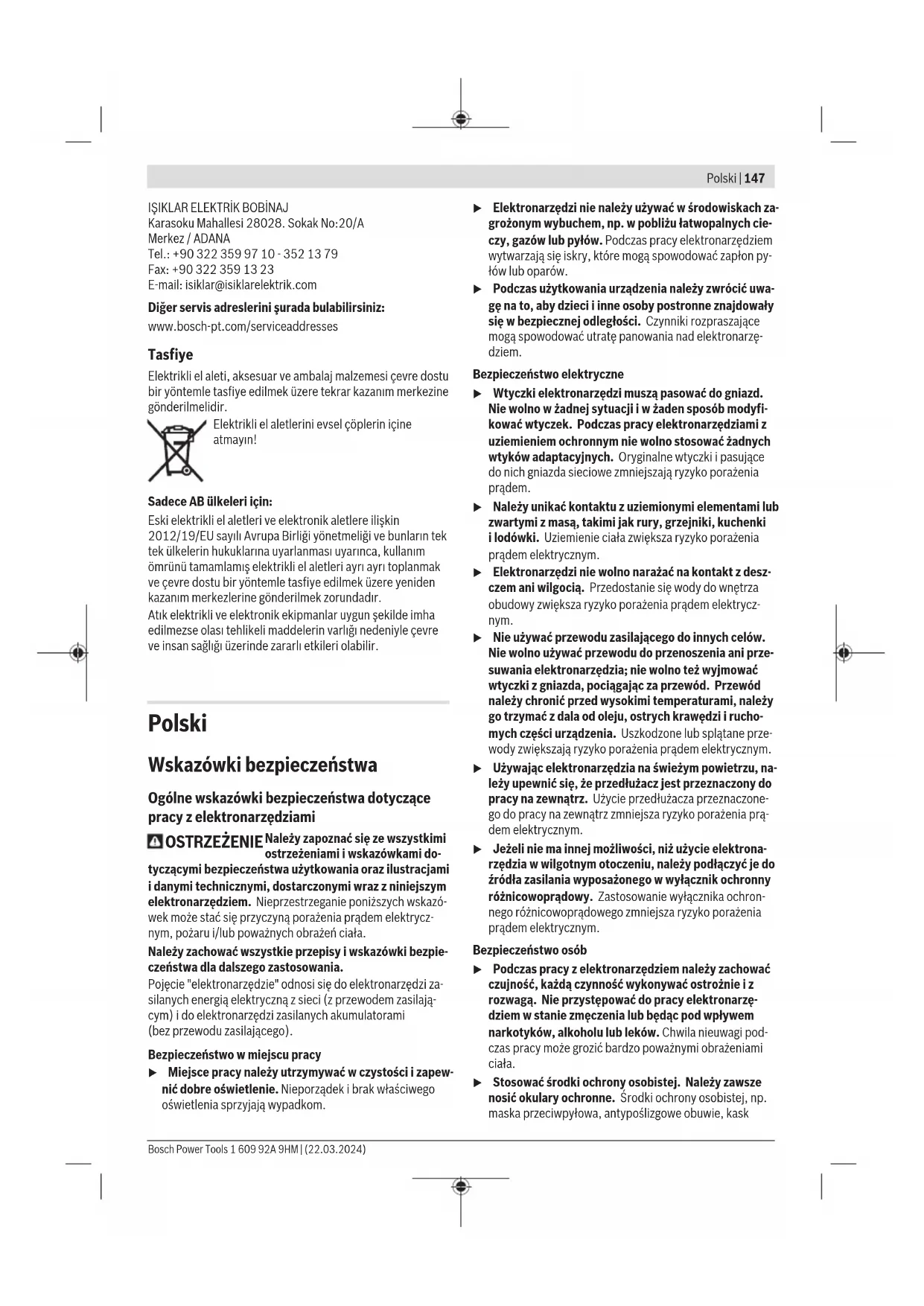 Karasoku Mahallesi 28028. Sokak No:20/A Merkez / ADANA Tel.: +903223599710 -3521379 Fax: +903223591323 E-mail: isiklar@isiklarelektrik.com Diğer servis adreslerini şurada bulabilirsiniz: www.bosch-pt.com/serviceaddresses Tasfiye Elektrikli el aleti, aksesuar ve ambalaj malzemesi çevre dostu bir yöntemle tasfiye edilmek üzere tekrar kazanım merkezine gönderilmelidir. Elektrikli el aletlerini evsel çöplerin içine atmayın! Sadece AB ülkeleri için: Eski elektrikli el aletleri ve elektronik aletlere ilişkin 2012/19/EU sayılı Avrupa Birliği yönetmeliği ve bunların tek tek ülkelerin hukuklarına uyarlanması uyarınca, kullanım ömrünü tamamlamış elektrikli el aletleri ayrı ayrı toplanmak ve çevre dostu bir yöntemle tasfiye edilmek üzere yeniden kazanım merkezlerine gönderilmek zorundadır. Atık elektrikli ve elektronik ekipmanlar uygun şekilde imha edilmezse olası tehlikeli maddelerin varlığı nedeniyle çevre ve insan sağlığı üzerinde zararlı etkileri olabilir. Polski Wskazówki bezpieczeństwa Ogólne wskazówki bezpieczeństwa dotyczące pracy z elektronarzędziami OSTRZEŻENIE Należy zapoznać się ze wszystkimi ostrzeżeniami i wskazówkami do- tyczącymi bezpieczeństwa użytkowania oraz ilustracjami i danymi technicznymi, dostarczonymi wraz z niniejszym elektronarzędziem. Nieprzestrzeganie poniższych wskazó- wek może stać się przyczyną porażenia prądem elektrycz- nym, pożaru i/lub poważnych obrażeń ciała. Należy zachować wszystkie przepisy i wskazówki bezpie- czeństwa dla dalszego zastosowania. Pojęcie "elektronarzędzie" odnosi się do elektronarzędzi za- silanych energią elektryczną z sieci (z przewodem zasilają- cym) i do elektronarzędzi zasilanych akumulatorami (bezprzewodu zasilającego). Bezpieczeństwo w miejscu pracy u Miejsce pracy należy utrzymywać w czystości i zapew- nić dobre oświetlenie. Nieporządek i brak właściwego oświetlenia sprzyjają wypadkom. u Elektronarzędzi nie należy używać w środowiskach za- grożonym wybuchem, np. w pobliżu łatwopalnych cie- czy, gazów lub pyłów. Podczas pracy elektronarzędziem wytwarzają się iskry, które mogą spowodować zapłon py- łów lub oparów. u Podczas użytkowania urządzenia należy zwrócić uwa- gę na to, aby dzieci i inne osoby postronne znajdowały się w bezpiecznej odległości. Czynniki rozpraszające mogą spowodować utratę panowania nad elektronarzę- dziem. Bezpieczeństwo elektryczne u Wtyczki elektronarzędzi muszą pasować do gniazd. Nie wolno w żadnej sytuacji i w żaden sposób modyfi- kować wtyczek. Podczas pracy elektronarzędziami z uziemieniem ochronnym nie wolno stosować żadnych wtyków adaptacyjnych. Oryginalne wtyczki i pasujące do nich gniazda sieciowe zmniejszają ryzyko porażenia prądem. u Należy unikać kontaktu z uziemionymi elementami lub zwartymi z masą, takimi jak rury, grzejniki, kuchenki ilodówki. Uziemienie ciała zwiększa ryzyko porażenia prądem elektrycznym. u Elektronarzędzi nie wolno narażać na kontakt z desz- czem ani wilgocią. Przedostanie się wody do wnętrza obudowy zwiększa ryzyko porażenia prądem elektrycz- nym. u Nie używać przewodu zasilającego do innych celów. Nie wolno używać przewodu do przenoszenia ani prze- suwania elektronarzędzia; nie wolno też wyjmować wtyczki z gniazda, pociągając za przewód. Przewód należy chronić przed wysokimi temperaturami, należy go trzymać zdala od oleju, ostrych krawędzi i rucho- mych części urządzenia. Uszkodzone lub splątane prze- wody zwiększają ryzyko porażenia prądem elektrycznym. u Używając elektronarzędzia na świeżym powietrzu, na- leży upewnić się, że przedłużacz jest przeznaczony do pracy na zewnątrz. Użycie przedłużacza przeznaczone- go do pracy na zewnątrz zmniejsza ryzyko porażenia prą- dem elektrycznym. u Jeżeli nie ma innej możliwości, niż użycie elektrona- rzędzia w wilgotnym otoczeniu, należy podłączyć je do źródła zasilania wyposażonego w wyłącznik ochronny różnicowoprądowy. Zastosowanie wyłącznika ochron- nego różnicowoprądowego zmniejsza ryzyko porażenia prądem elektrycznym. Bezpieczeństwo osób u Podczas pracy z elektronarzędziem należy zachować czujność, każdą czynność wykonywać ostrożnie i z rozwagą. Nie przystępować do pracy elektronarzę- dziem w stanie zmęczenia lub będąc pod wpływem narkotyków, alkoholu lub leków. Chwila nieuwagi pod- czas pracy może grozić bardzo poważnymi obrażeniami ciała. u Stosować środki ochrony osobistej. Należy zawsze nosić okulary ochronne. Środki ochrony osobistej, np. maska przeciwpyłowa, antypoślizgowe obuwie, kask Bosch Power Tools 1 609 92A 9HM | (22.03.2024)148 | Polski ochronny czy ochraniacze na uszy, w określonych warun- kach pracy obniżają ryzyko obrażeń ciała. u Należy unikać niezamierzonego uruchomienia narzę- dzia. Przed podłączeniem elektronarzędzia do źródła zasilania i/lub podłączeniem akumulatora, podniesie- niem albo transportem urządzenia, należy upewnić się, że włącznik elektronarzędzia znajduje się w pozy- cji wyłączonej. Przenoszenie elektronarzędzia z palcem opartym na włączniku/wyłączniku lub włożenie do gniaz- da sieciowego wtyczki włączonego narzędzia, może stać się przyczyną wypadków. u Przed włączeniem elektronarzędzia należy usunąć wszystkie narzędzia nastawcze i klucze maszynowe. Narzędzia lub klucze, pozostawione wruchomych czę- ściach urządzenia, mogą spowodować obrażenia ciała. u Należy unikać nienaturalnych pozycji przy pracy. Na- leży dbać o stabilną pozycję przy pracy i zachowanie równowagi. Dzięki temu można będzie łatwiej zapano- wać nad elektronarzędziem w nieprzewidzianych sytu- acjach. u Należy nosić odpowiednią odzież. Nie należy nosić luźnej odzieży ani biżuterii. Włosy i odzież należy trzy- mać z dala od ruchomych części. Luźna odzież, biżuteria lub długie